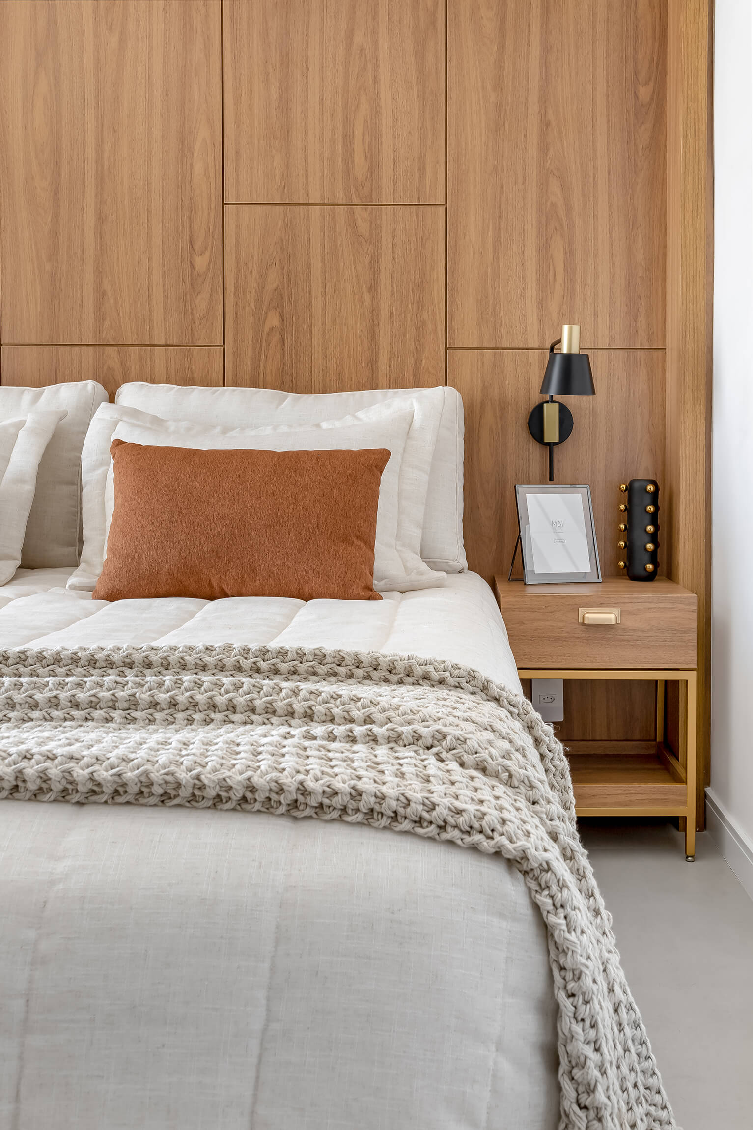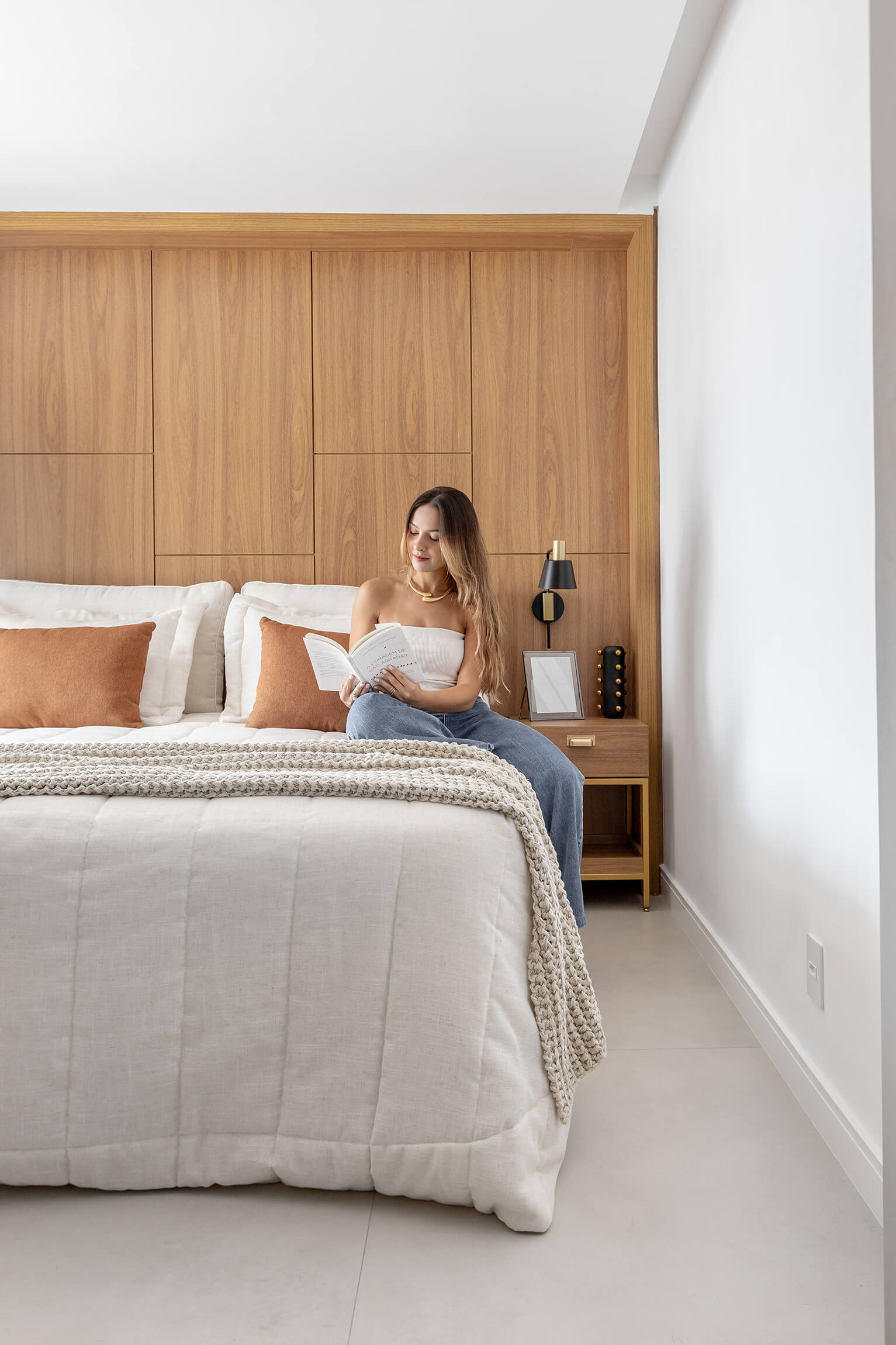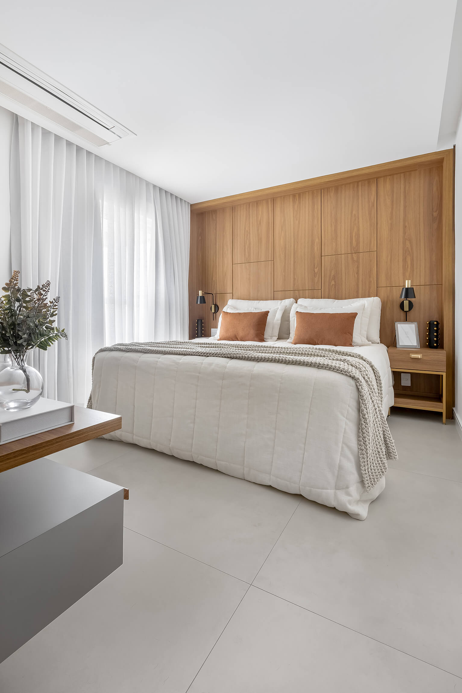 A paleta de cores neutras é uma base serena, enquanto laranja queimado e verde sálvia adicionam profundidade e calor ao ambiente.