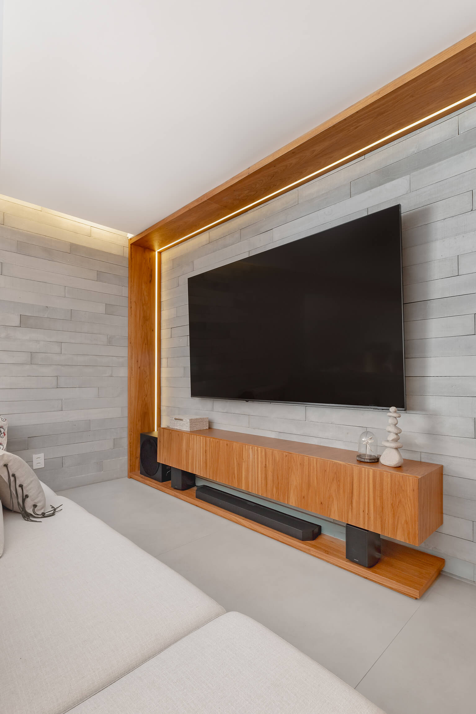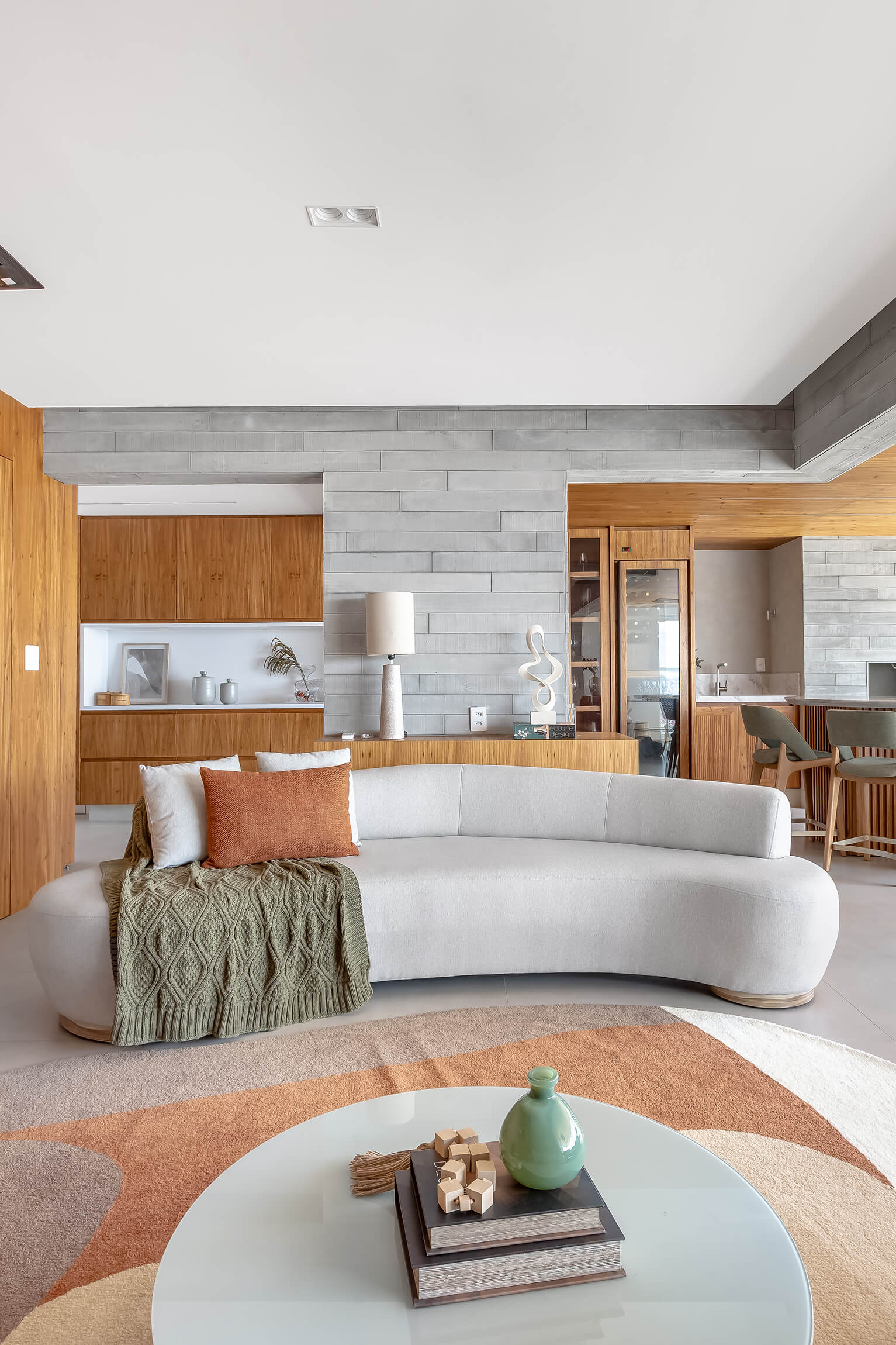 A arquiteta desenvolveu aqui um conceito que celebra a materialidade: o concreto bruto encontra a madeira, criando um diálogo entre o rígido e o orgânico.
