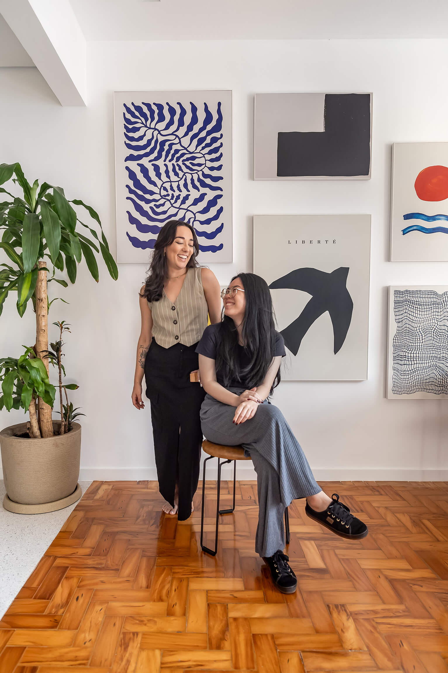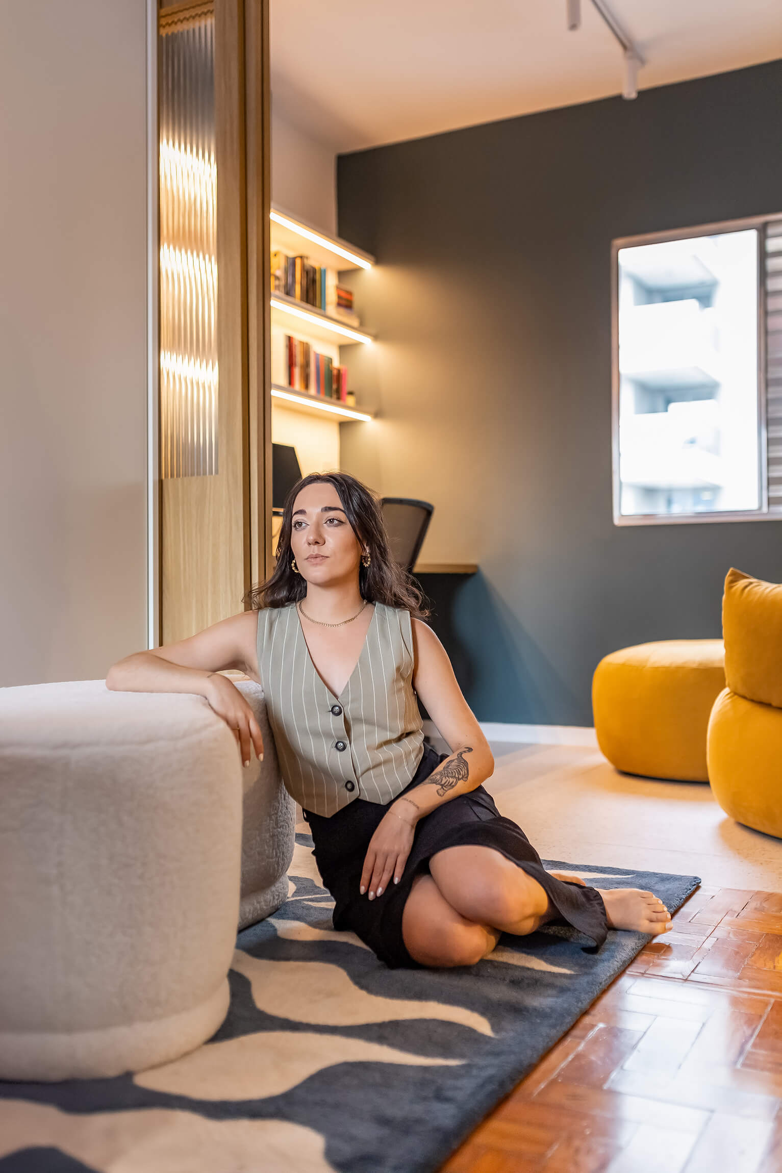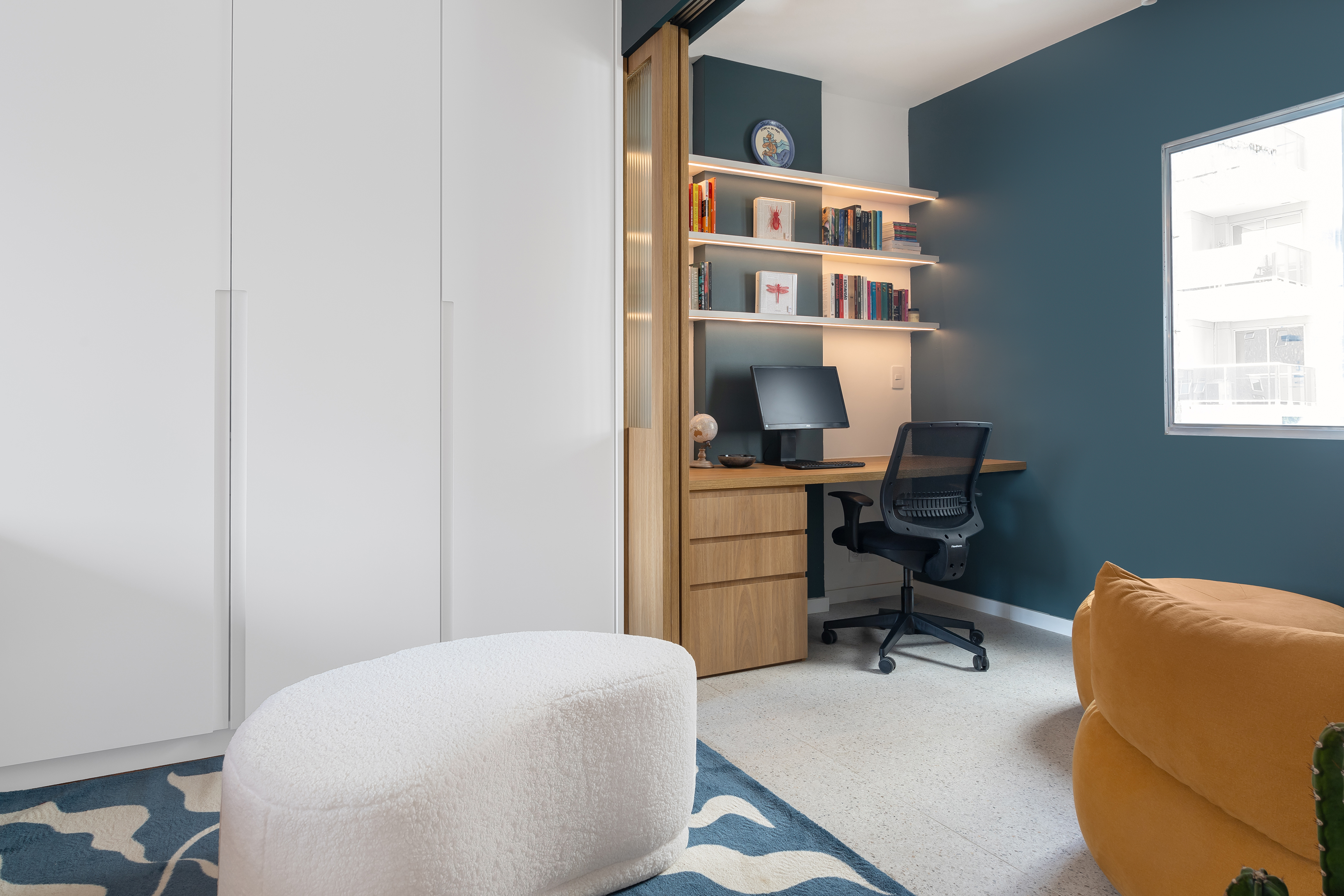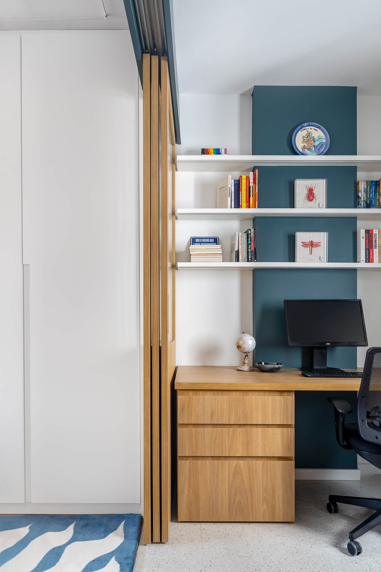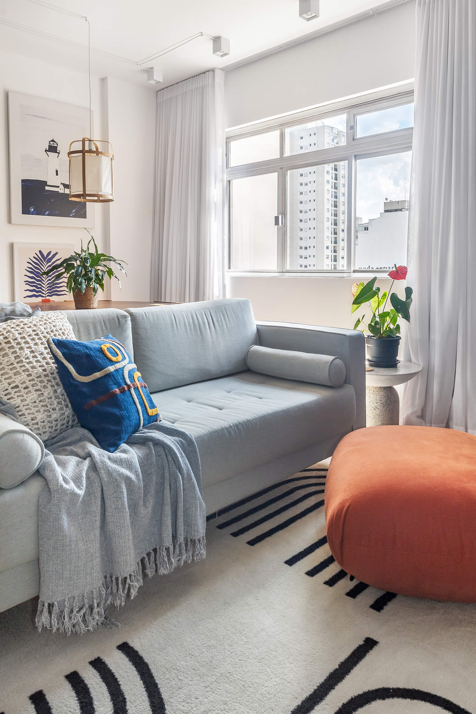 Nessas fotos, busquei ângulos que mostrassem como o design cheio de personalidade e a escolha das cores criam uma sensação de autenticidade e calmaria em todo o apartamento. E evidenciar a belíssima curadoria de arte na parede da sala.