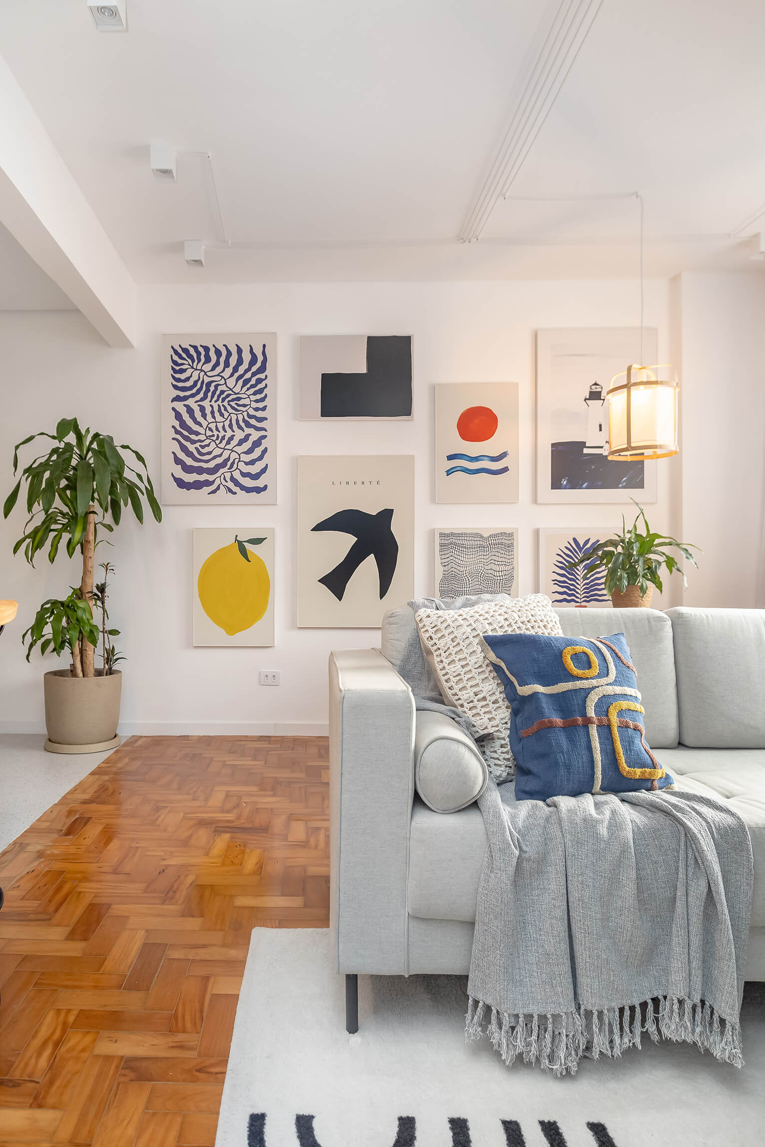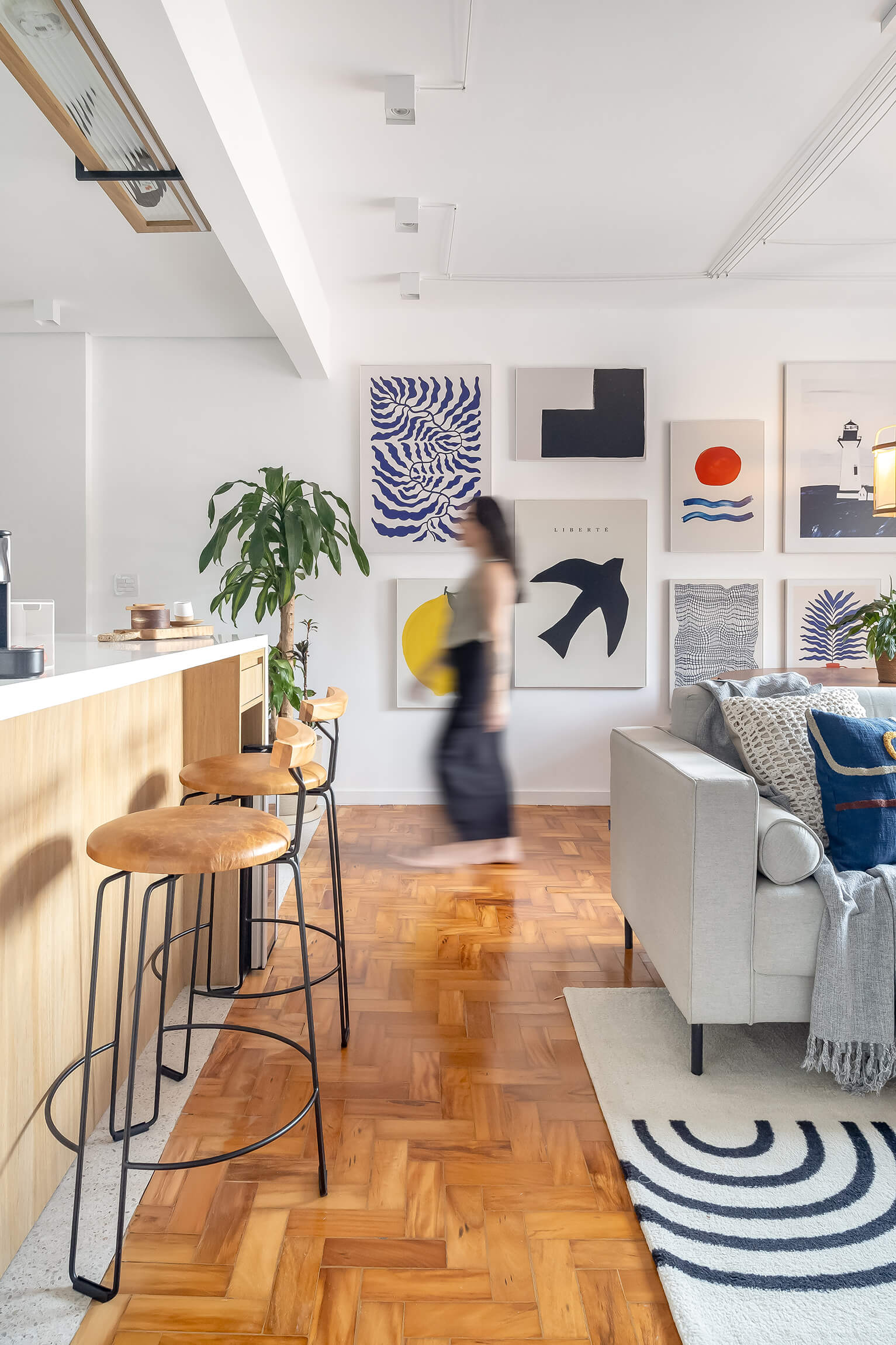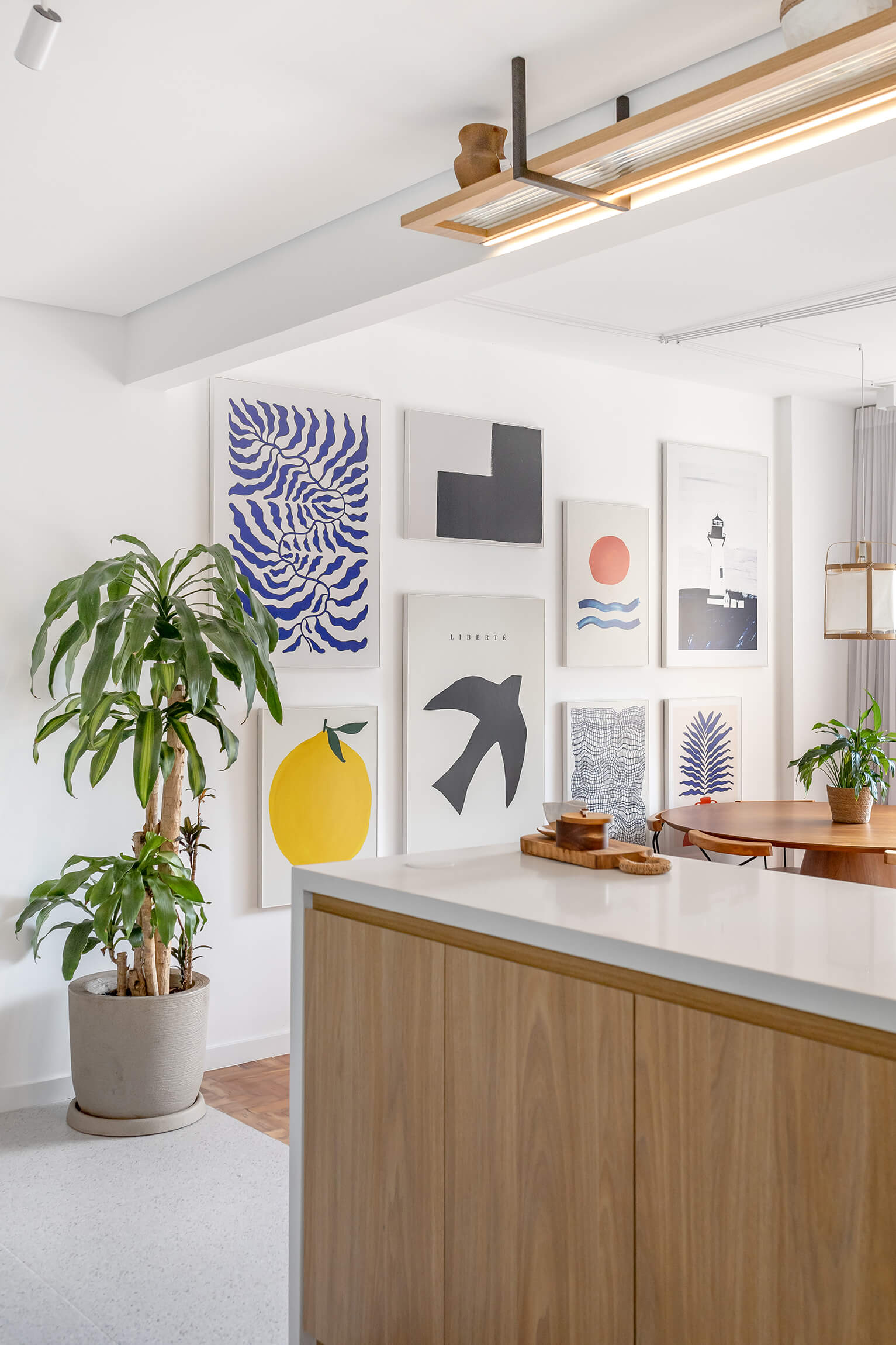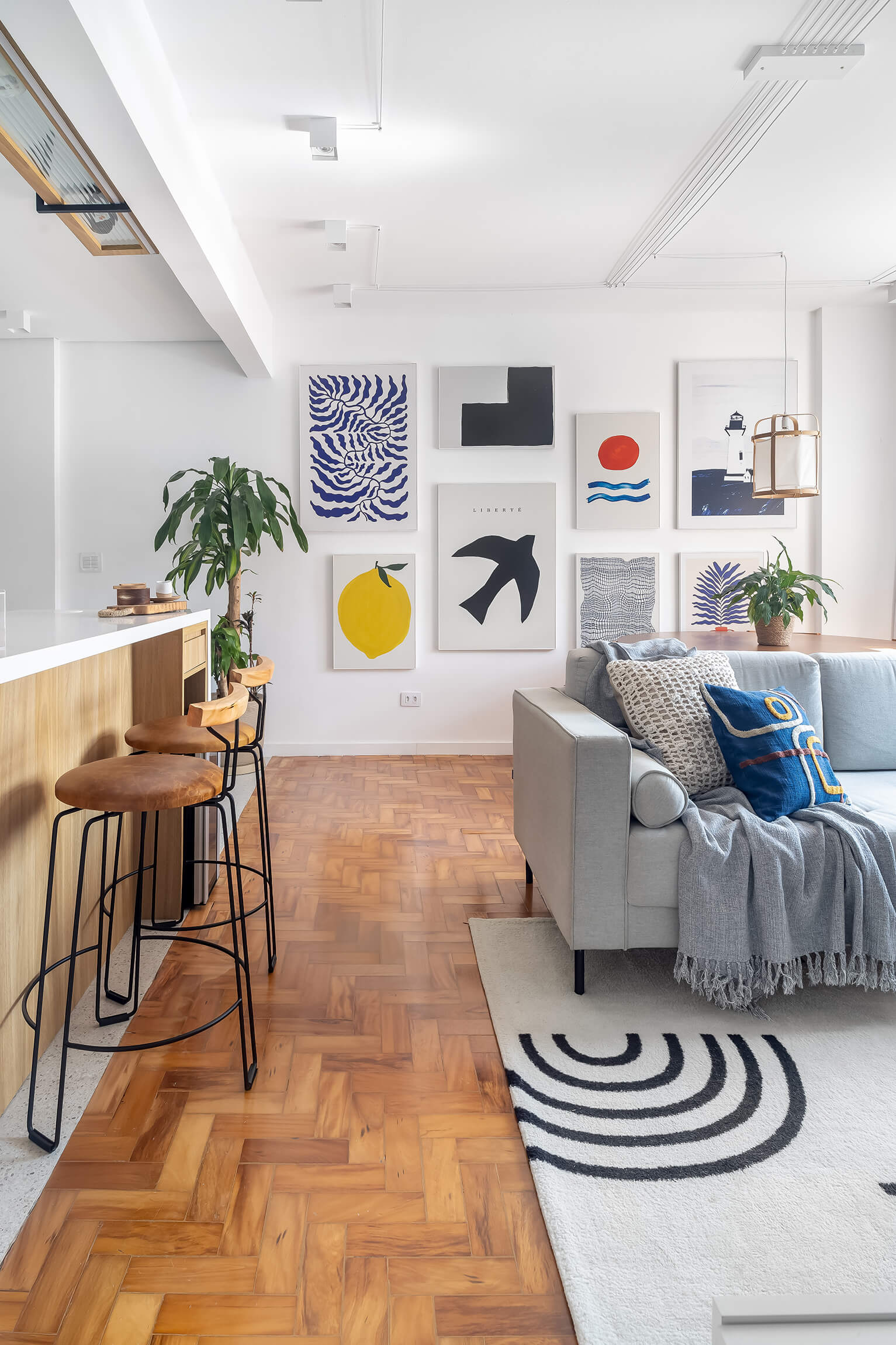 Um projeto cheio de personalidade, onde o azul e outras cores se encontram com a neutralidade para criar espaços acolhedores. Quadros que contam histórias através da arte e do design.