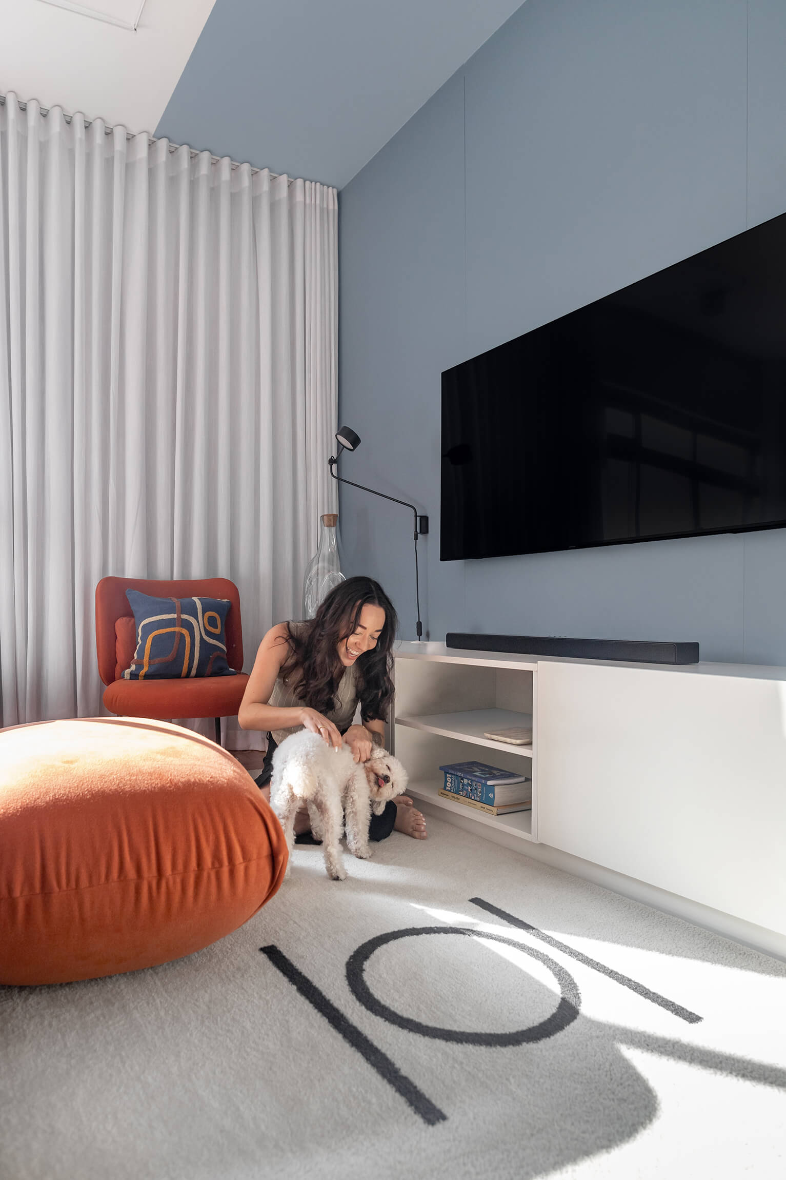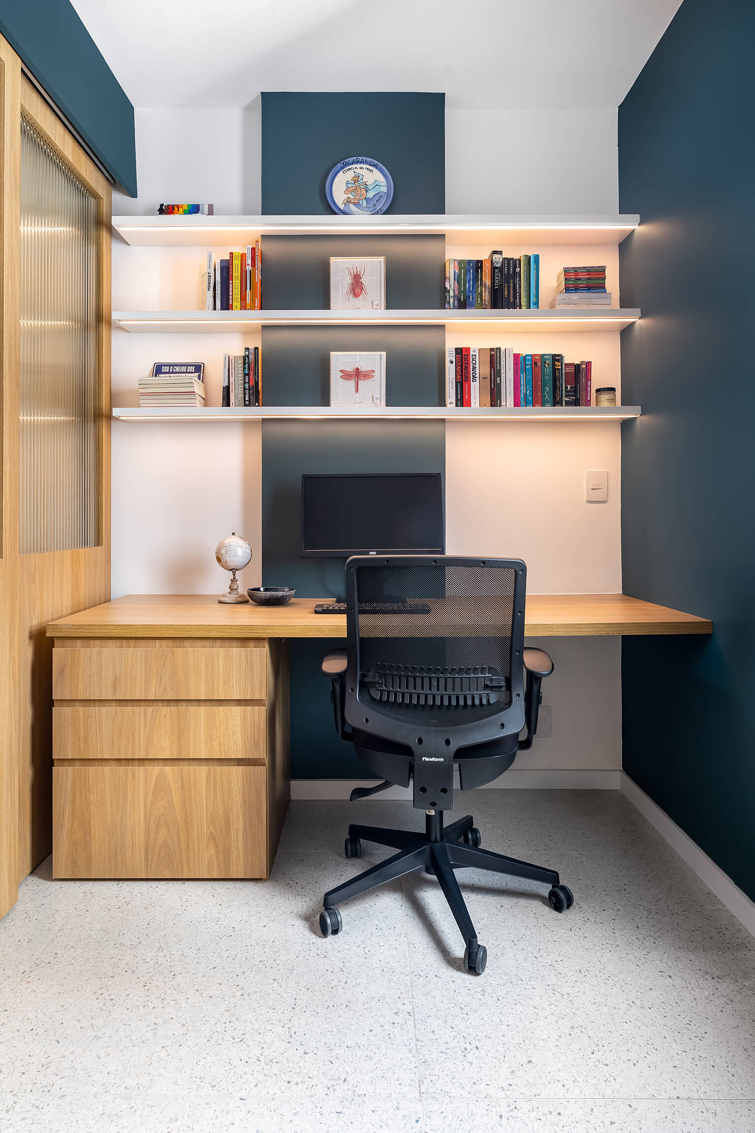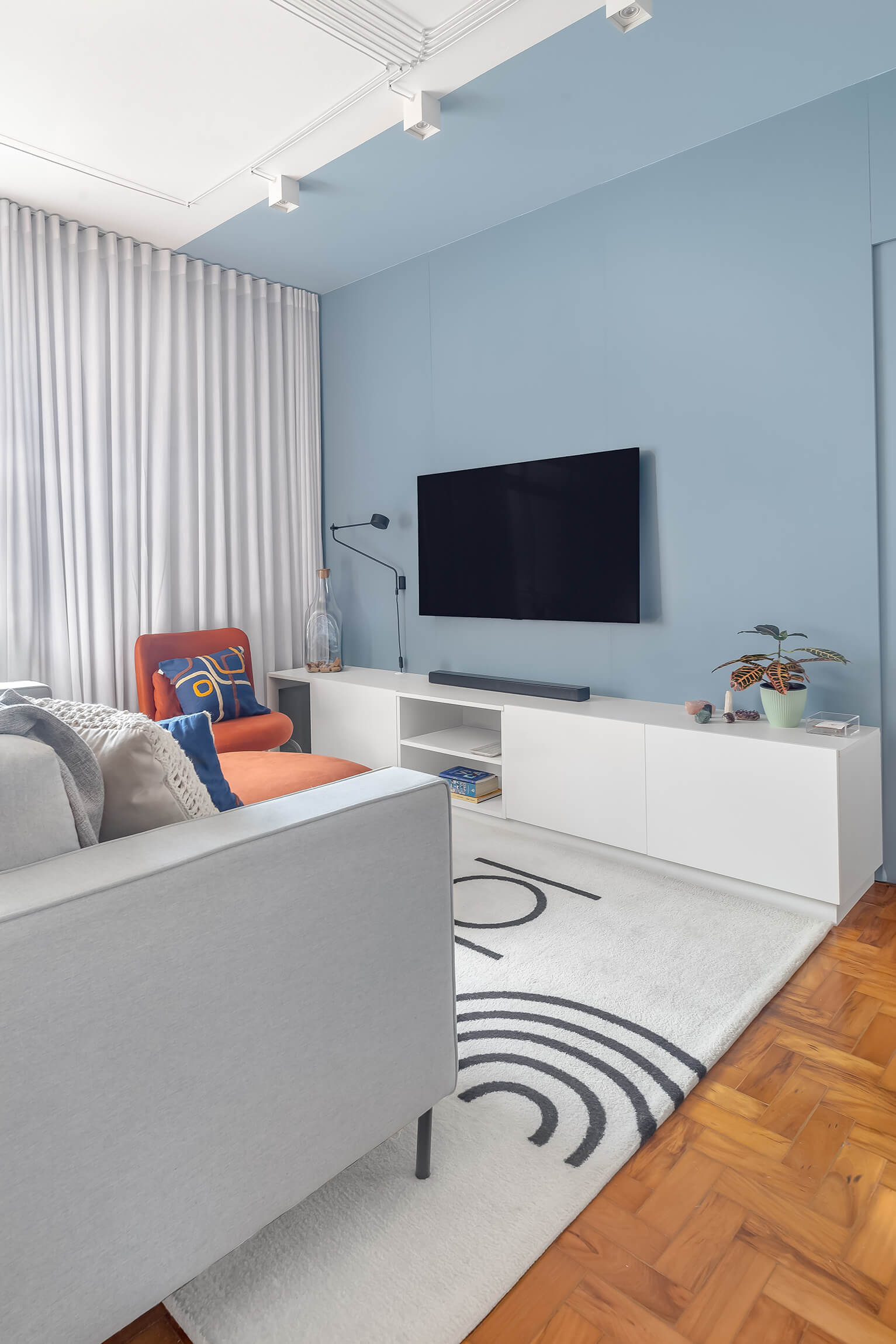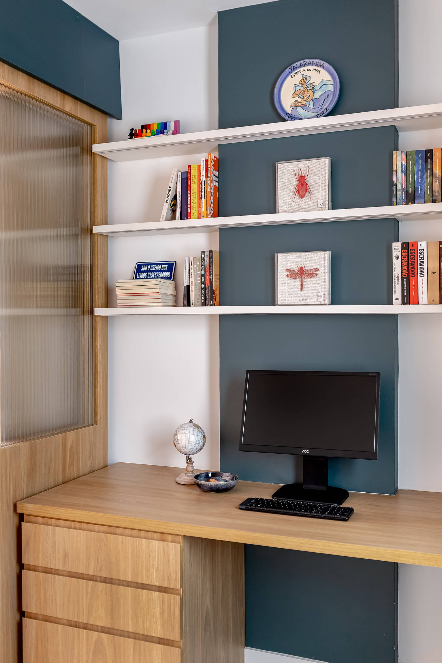 Um projeto cheio de personalidade, onde o azul e outras cores se encontram com a neutralidade para criar espaços acolhedores. Quadros que contam histórias através da arte e do design.