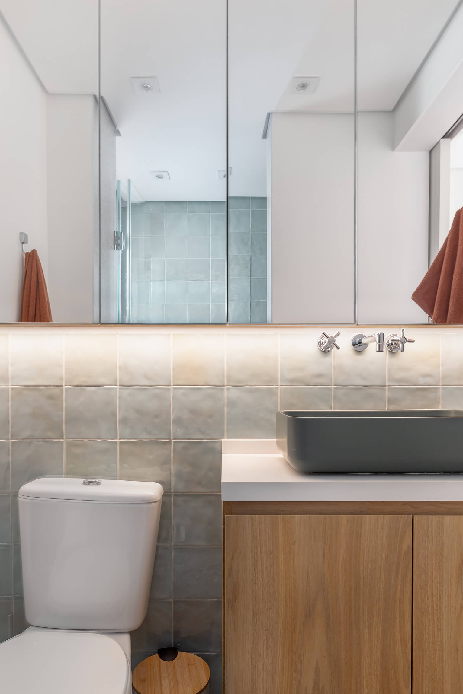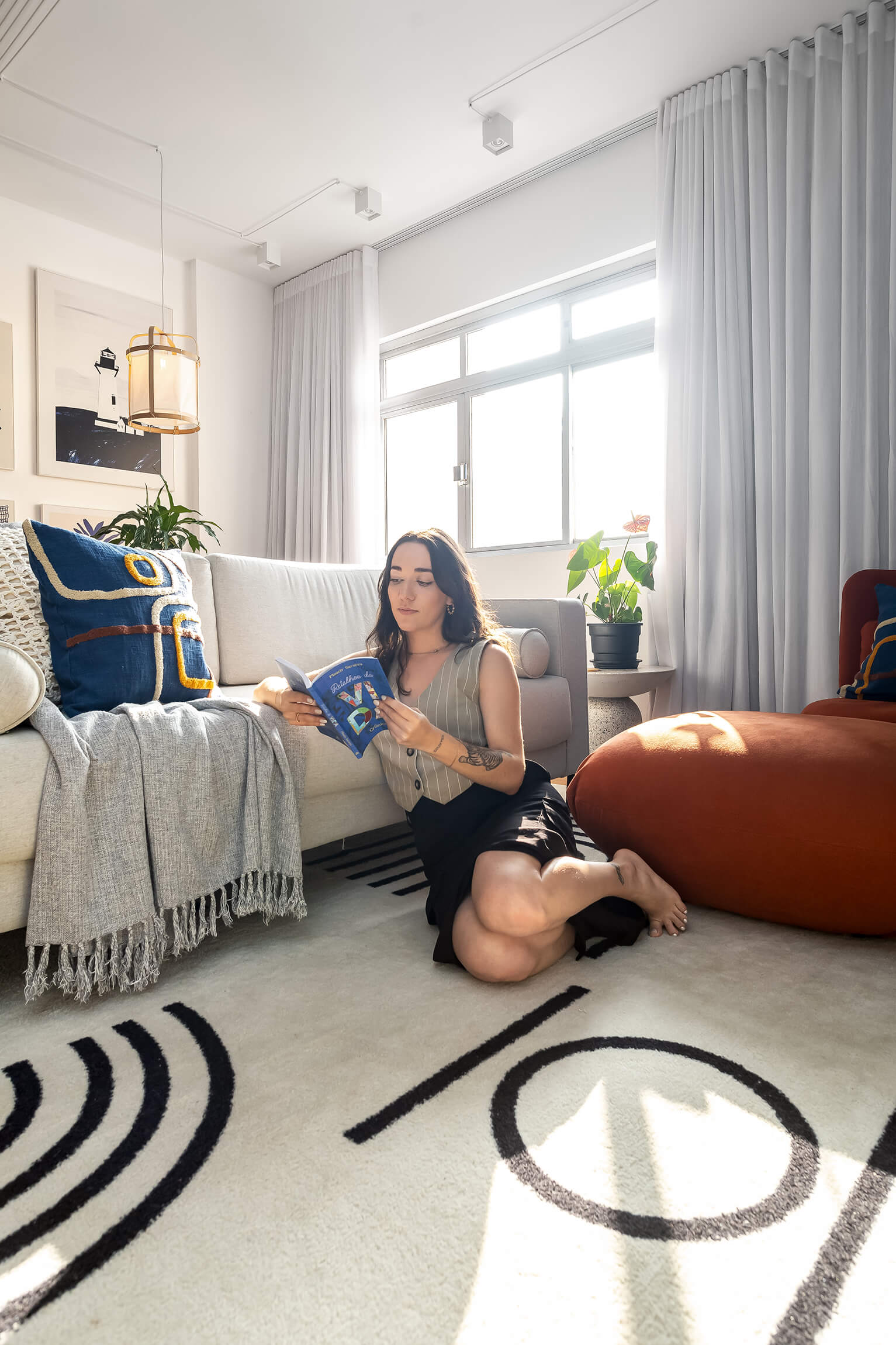 Nos detalhes, a luz natural revela as diferentes texturas, desde o brilho do revestimento da cozinha até o toque dos tecidos e plantas. O resultado é um registro fiel de um espaço que prioriza a personalidade e o conforto.
