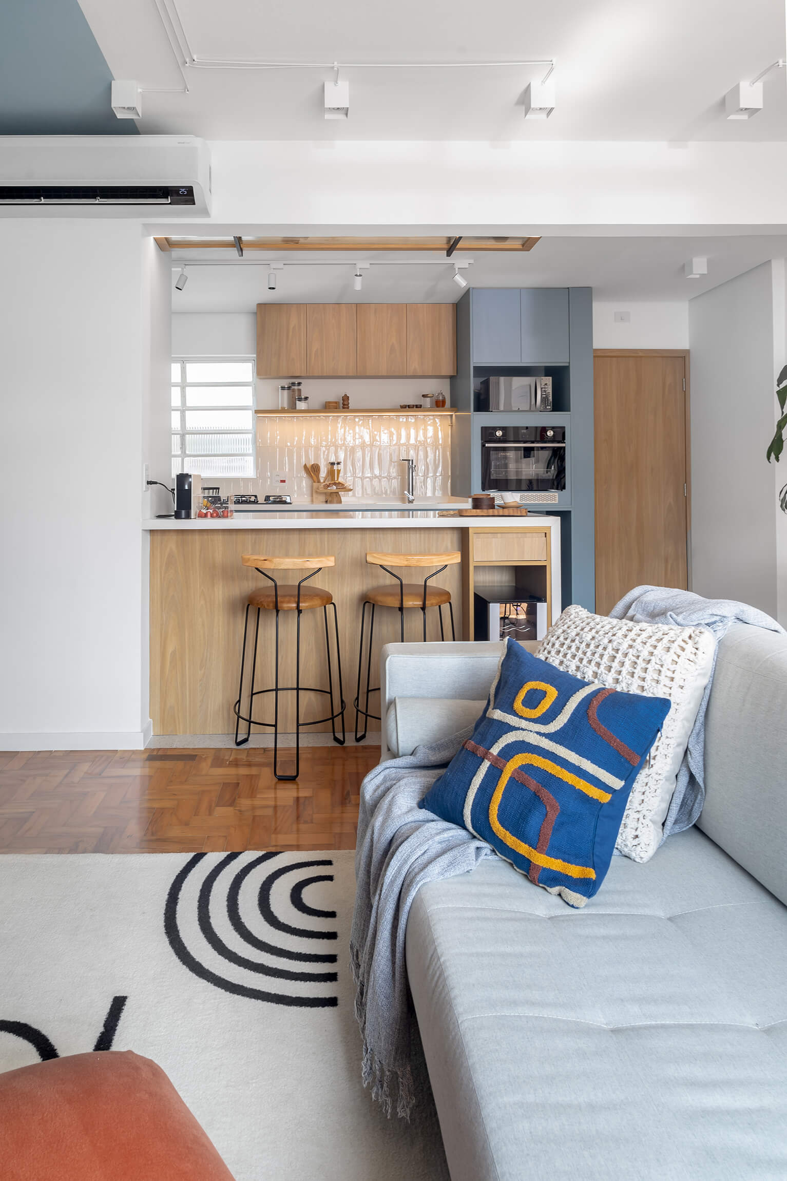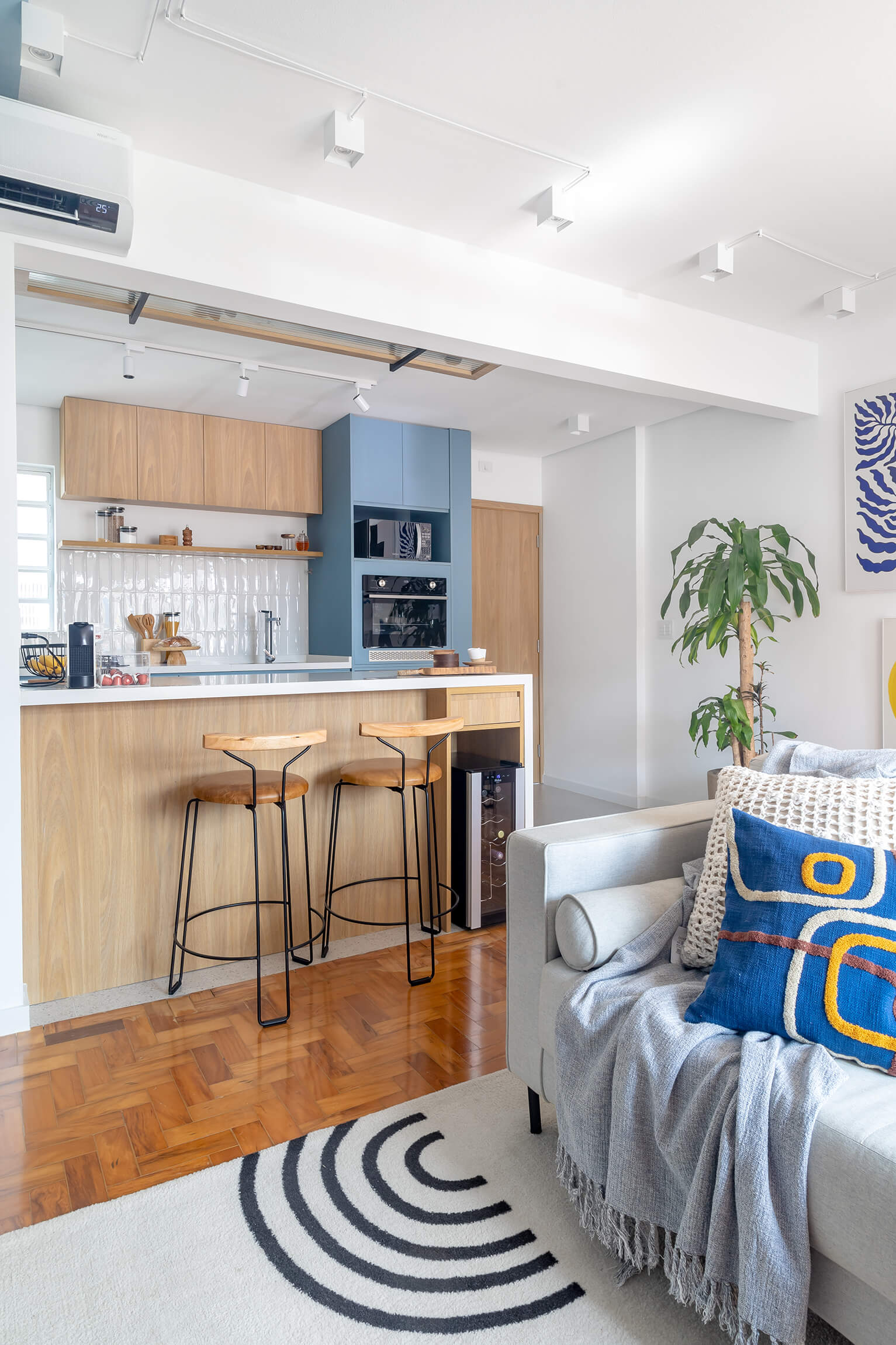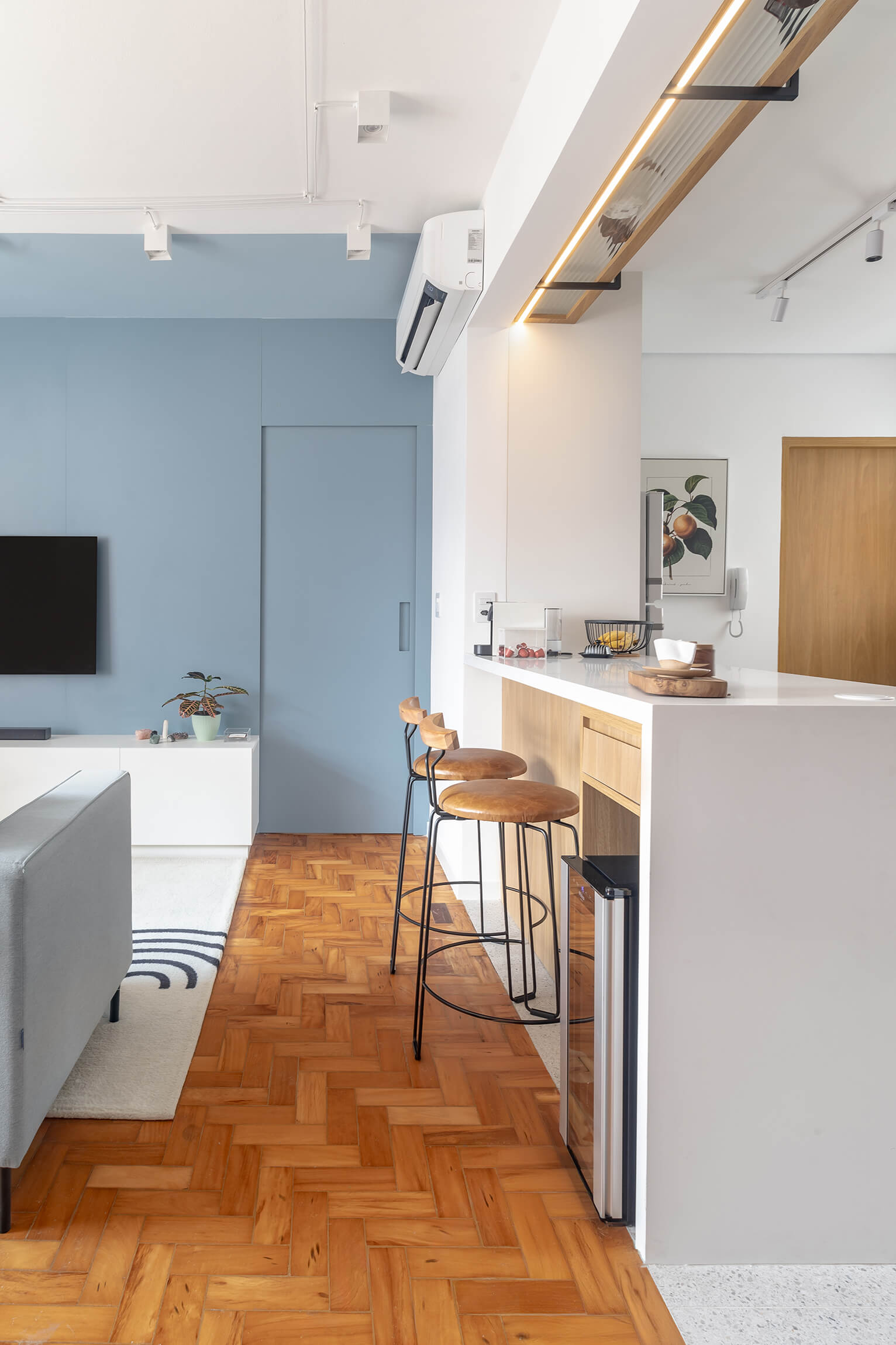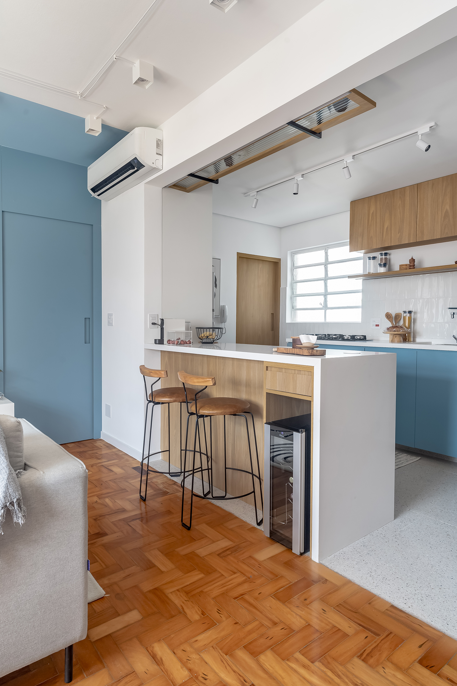 O projeto Lan se destaca pela integração completa entre a cozinha e a área social. O ponto de partida é o contraste entre o piso de taco original, que traz o calor da madeira, e a marcenaria em tons de azul, que moderniza o ambiente de forma leve.