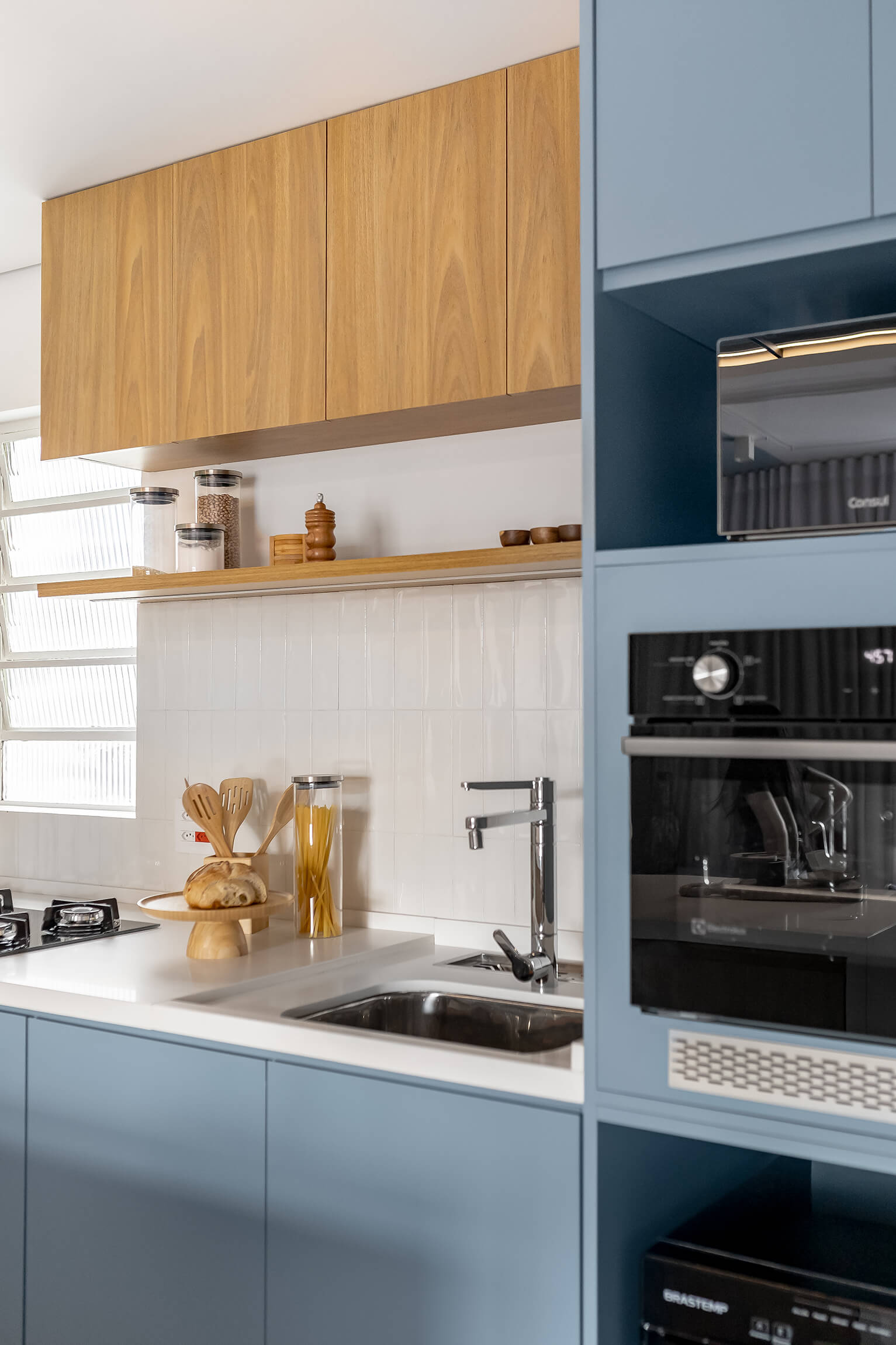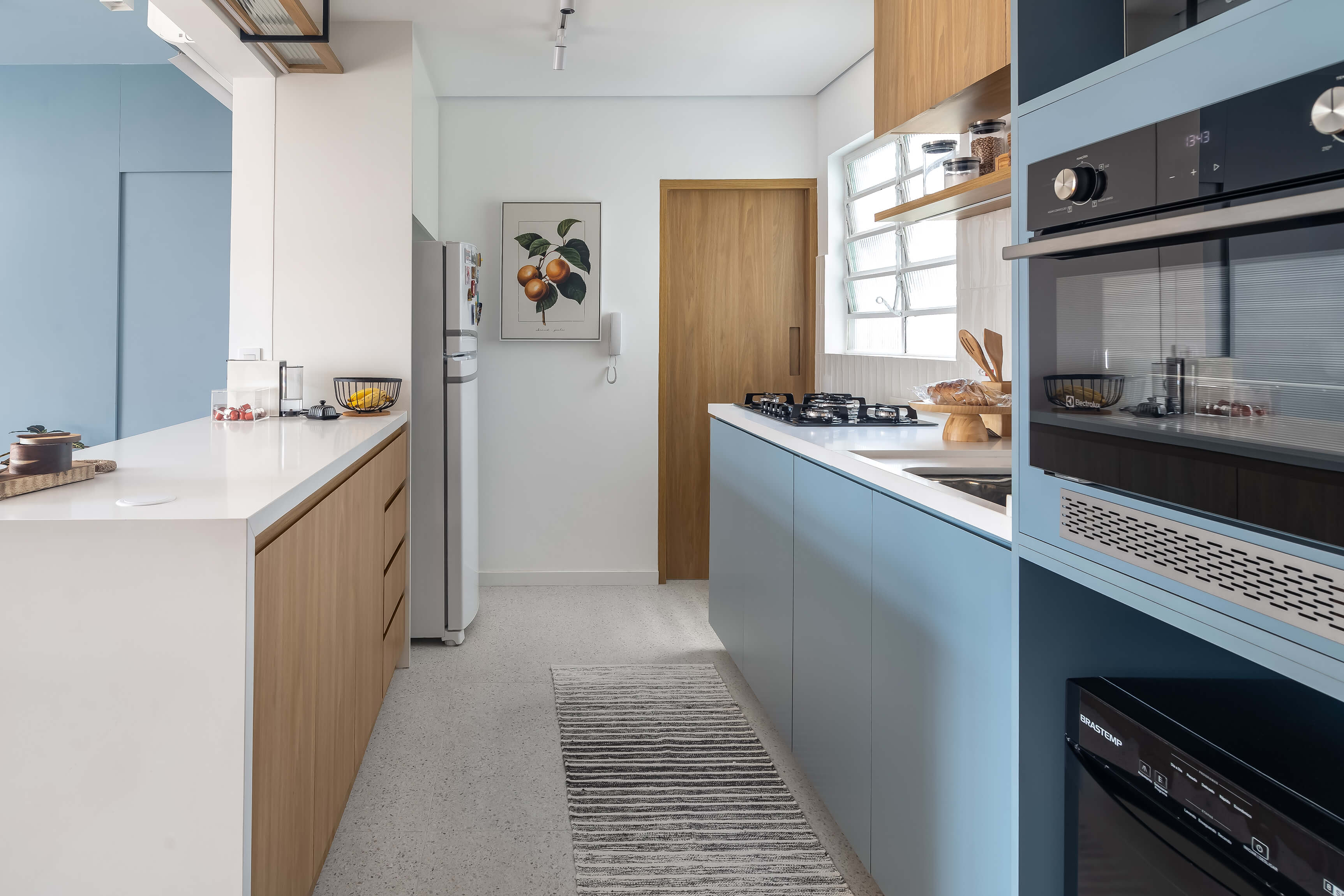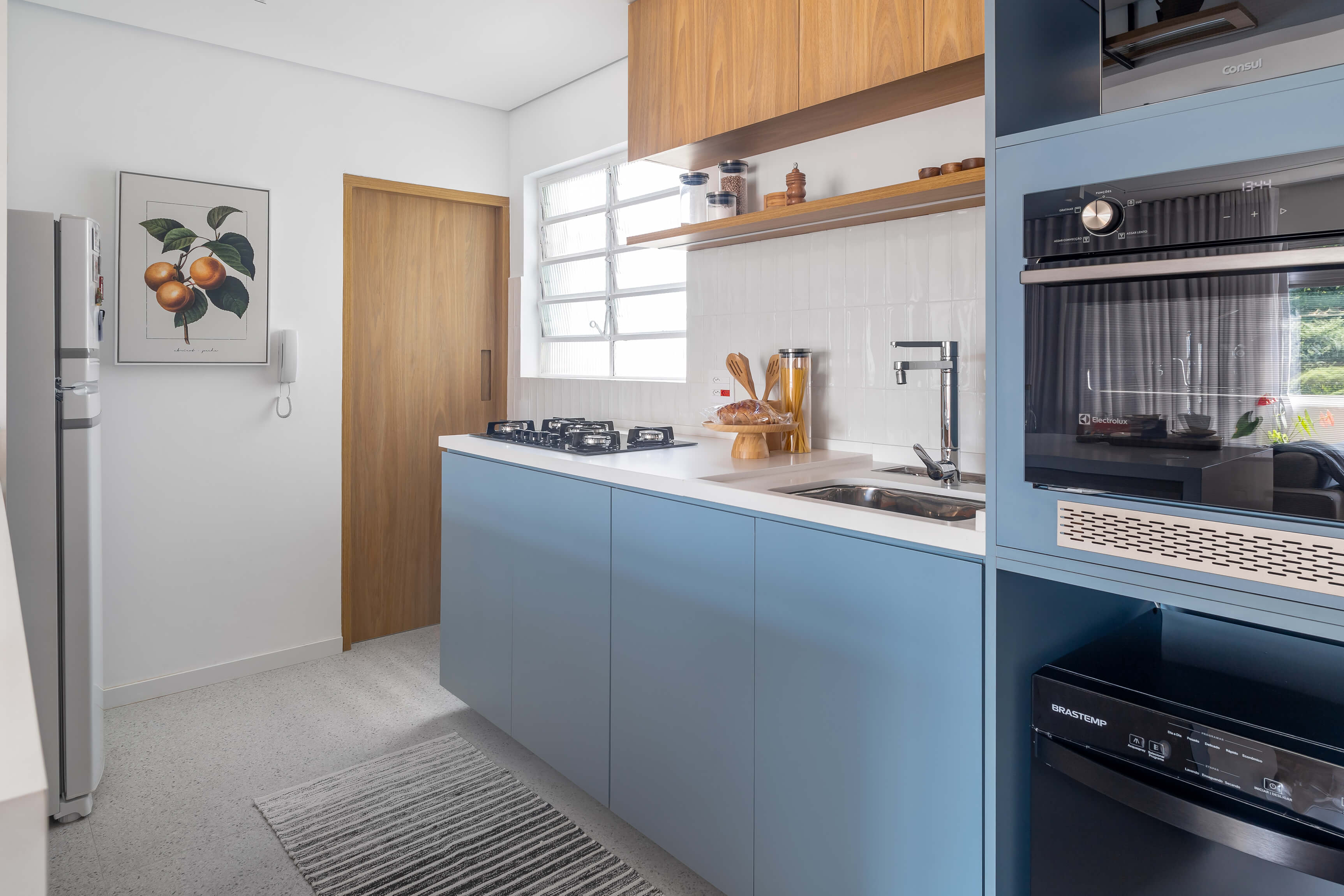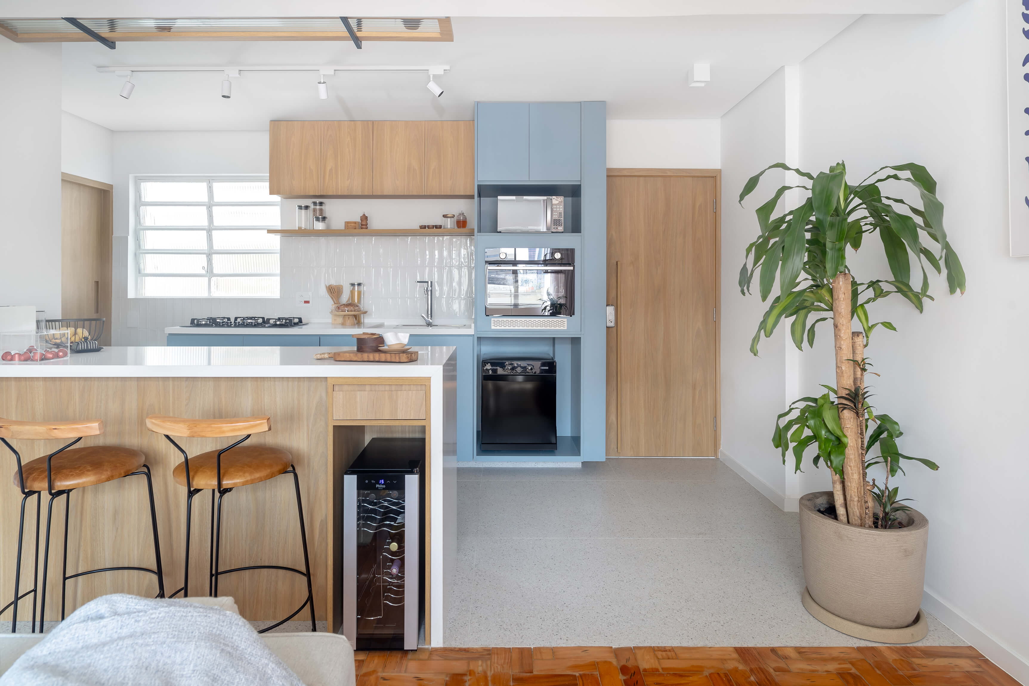 O projeto Lan se destaca pela integração completa entre a cozinha e a área social. O ponto de partida é o contraste entre o piso de taco original, que traz o calor da madeira, e a marcenaria em tons de azul, que moderniza o ambiente de forma leve.