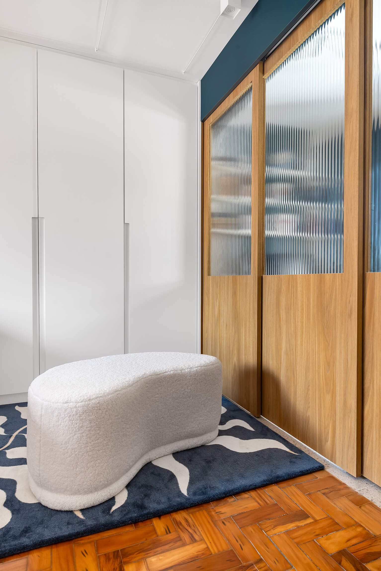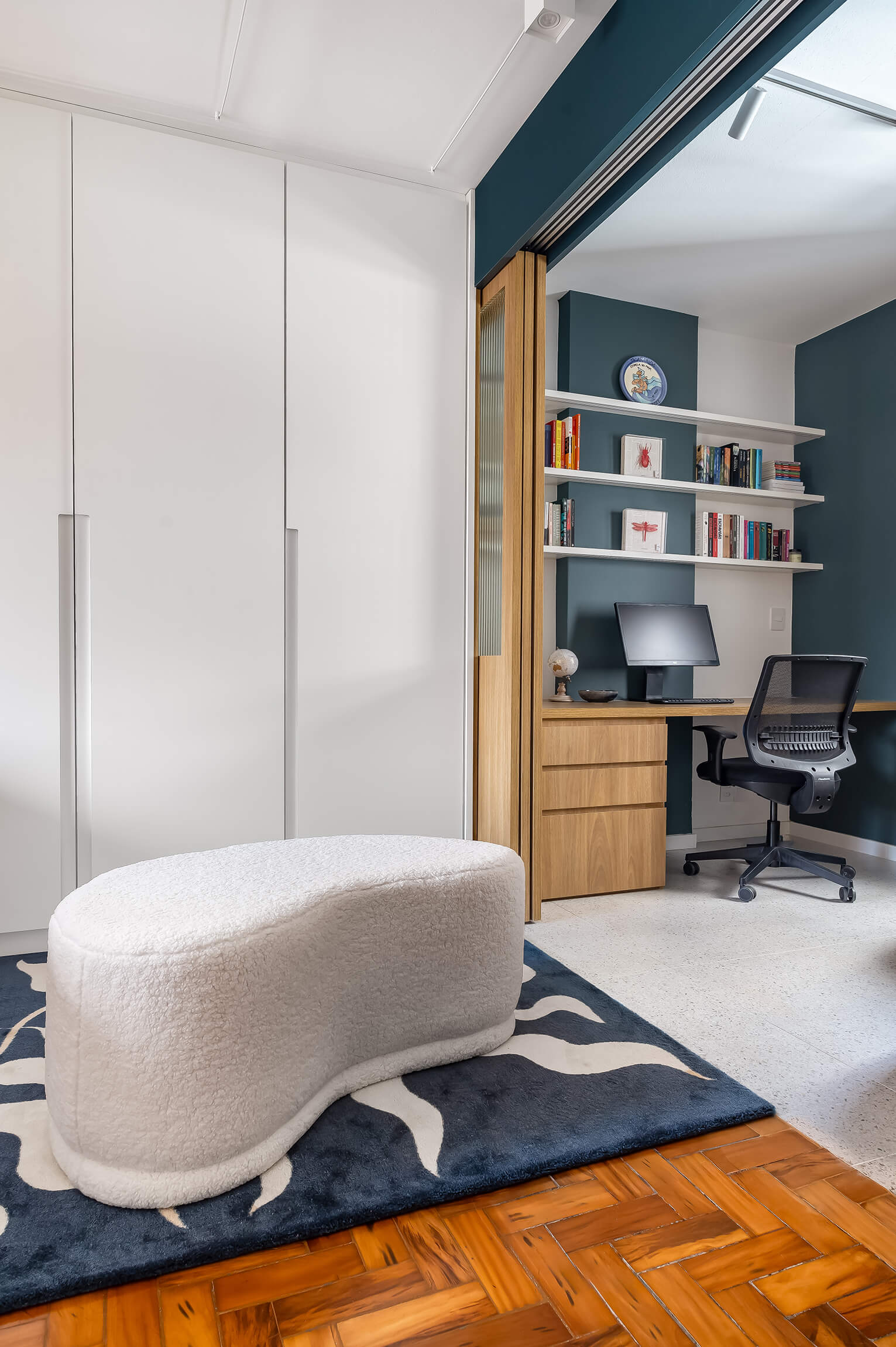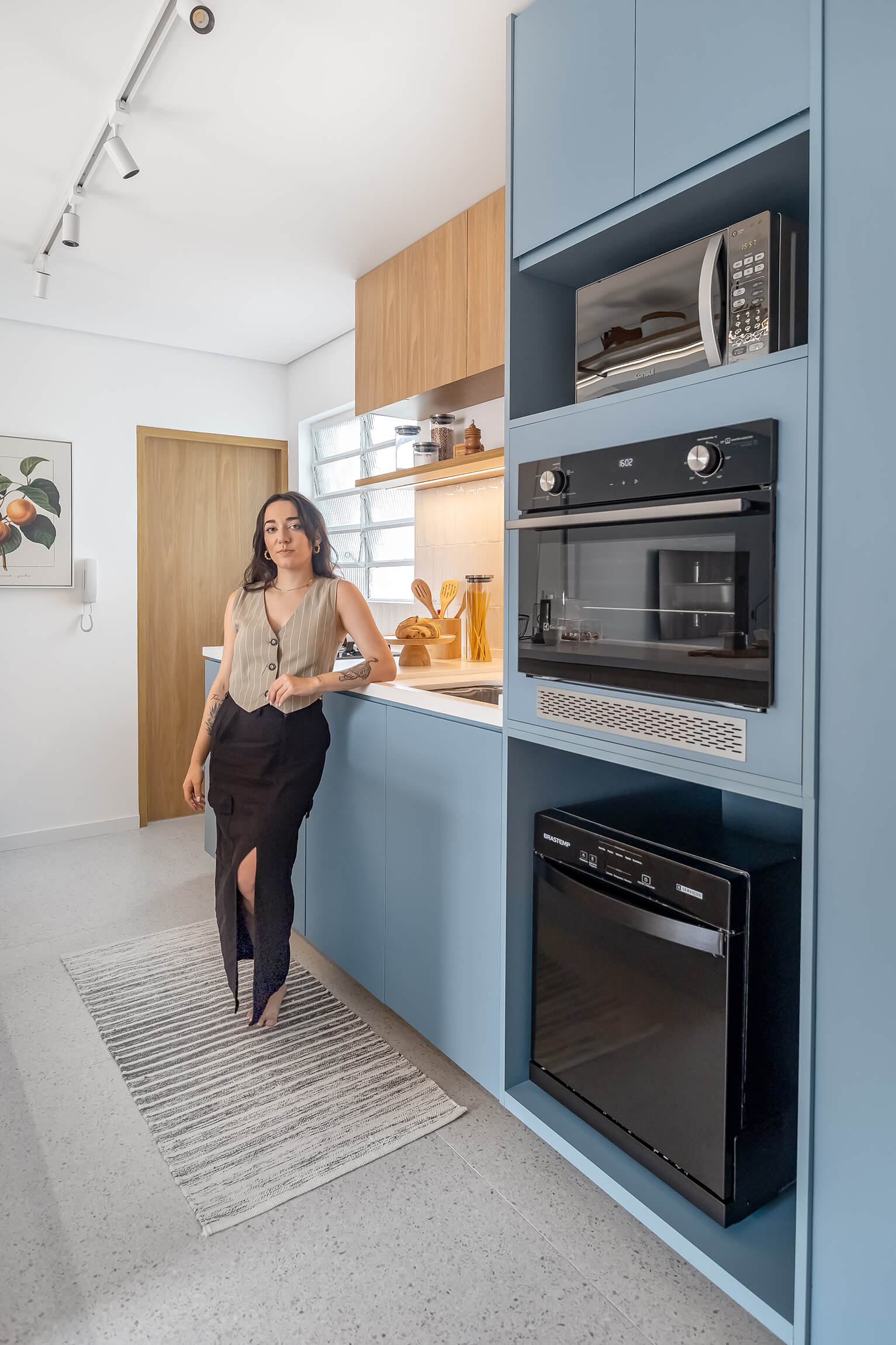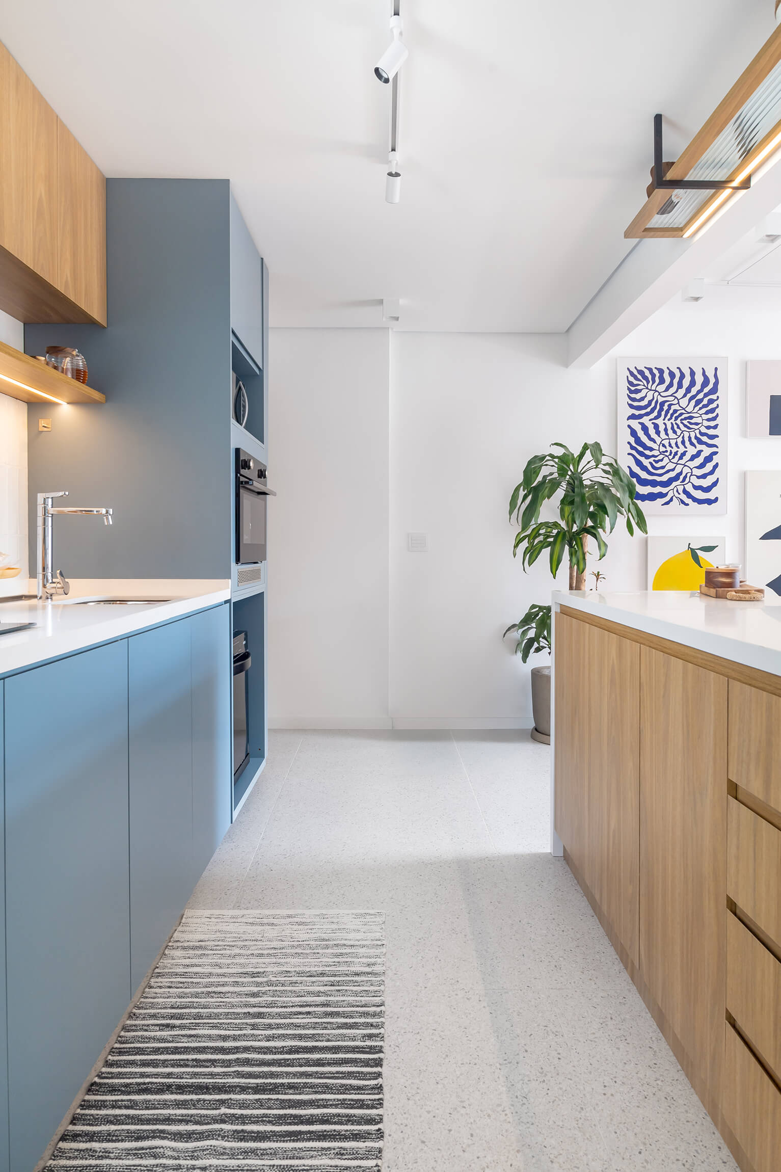 O projeto Lan se destaca pela integração completa entre a cozinha e a área social. O ponto de partida é o contraste entre o piso de taco original, que traz o calor da madeira, e a marcenaria em tons de azul, que moderniza o ambiente de forma leve.