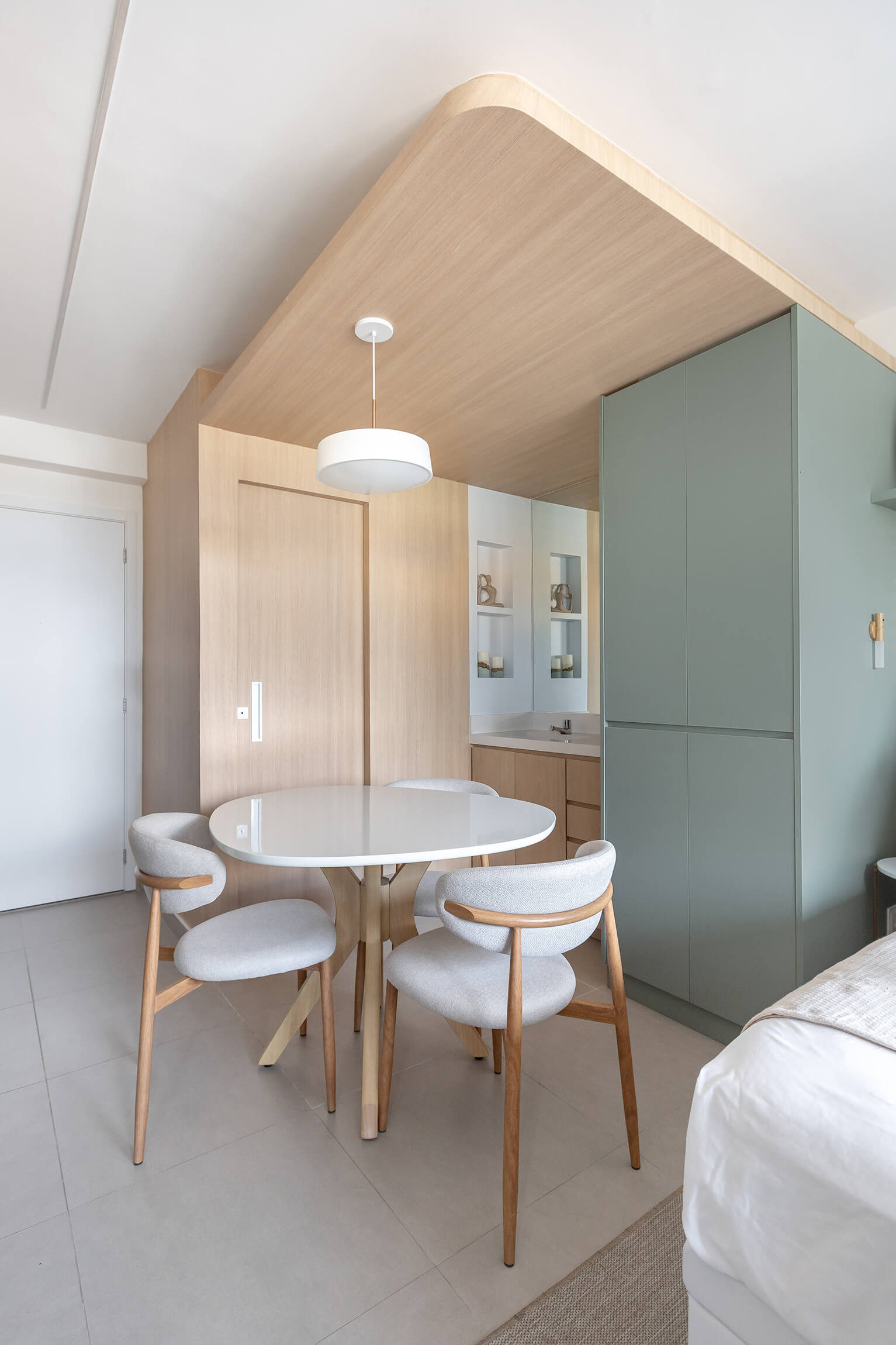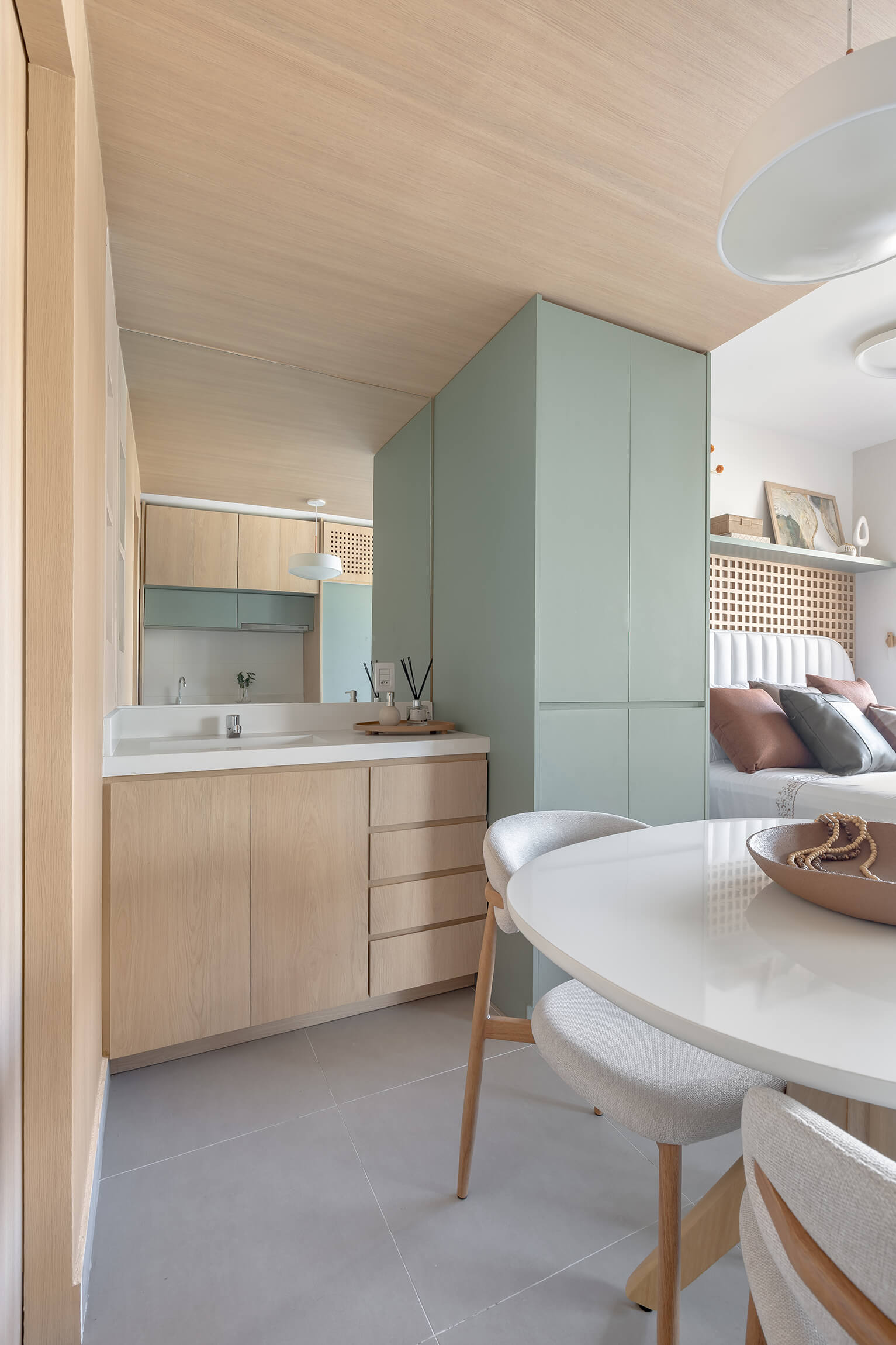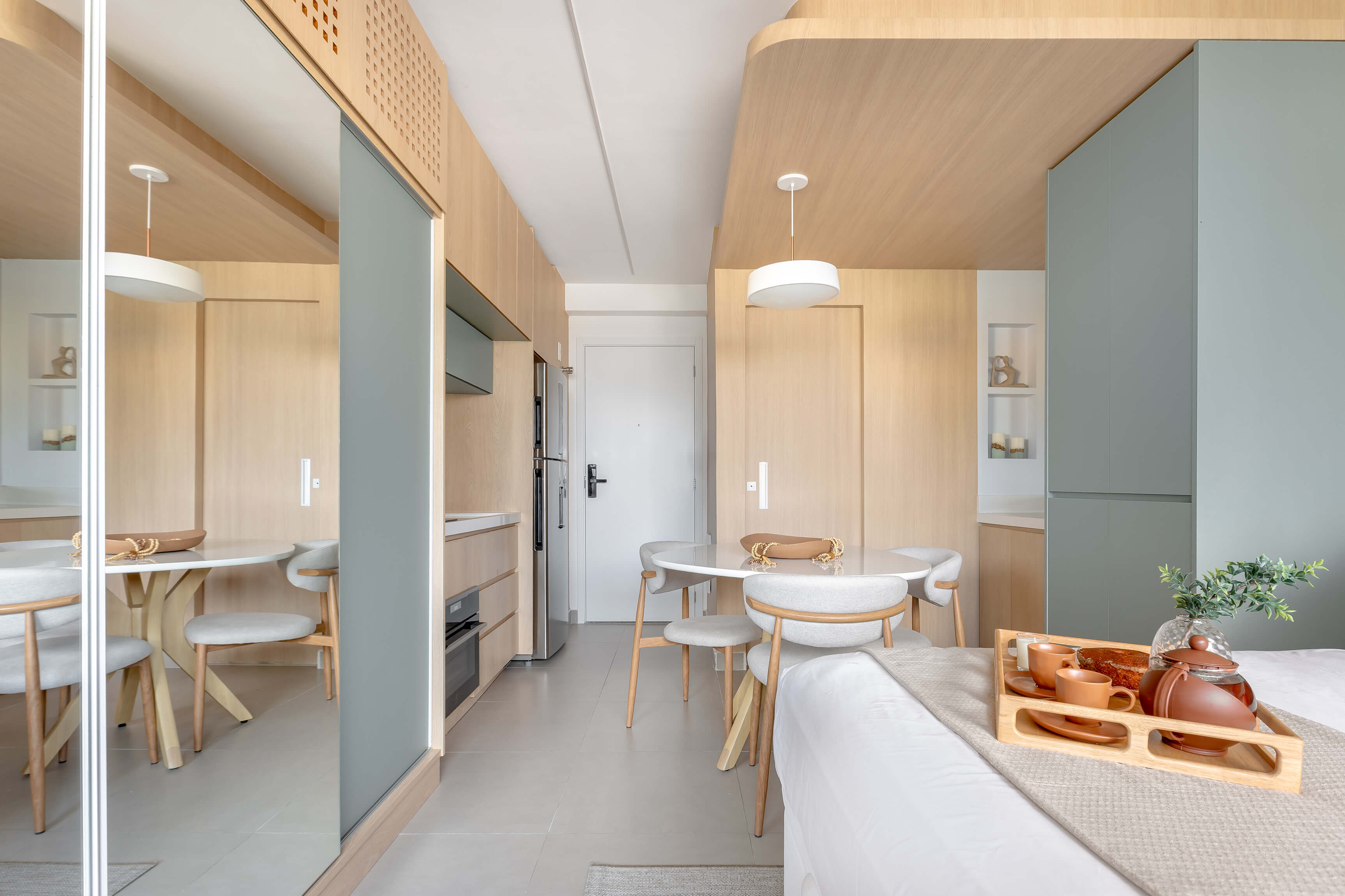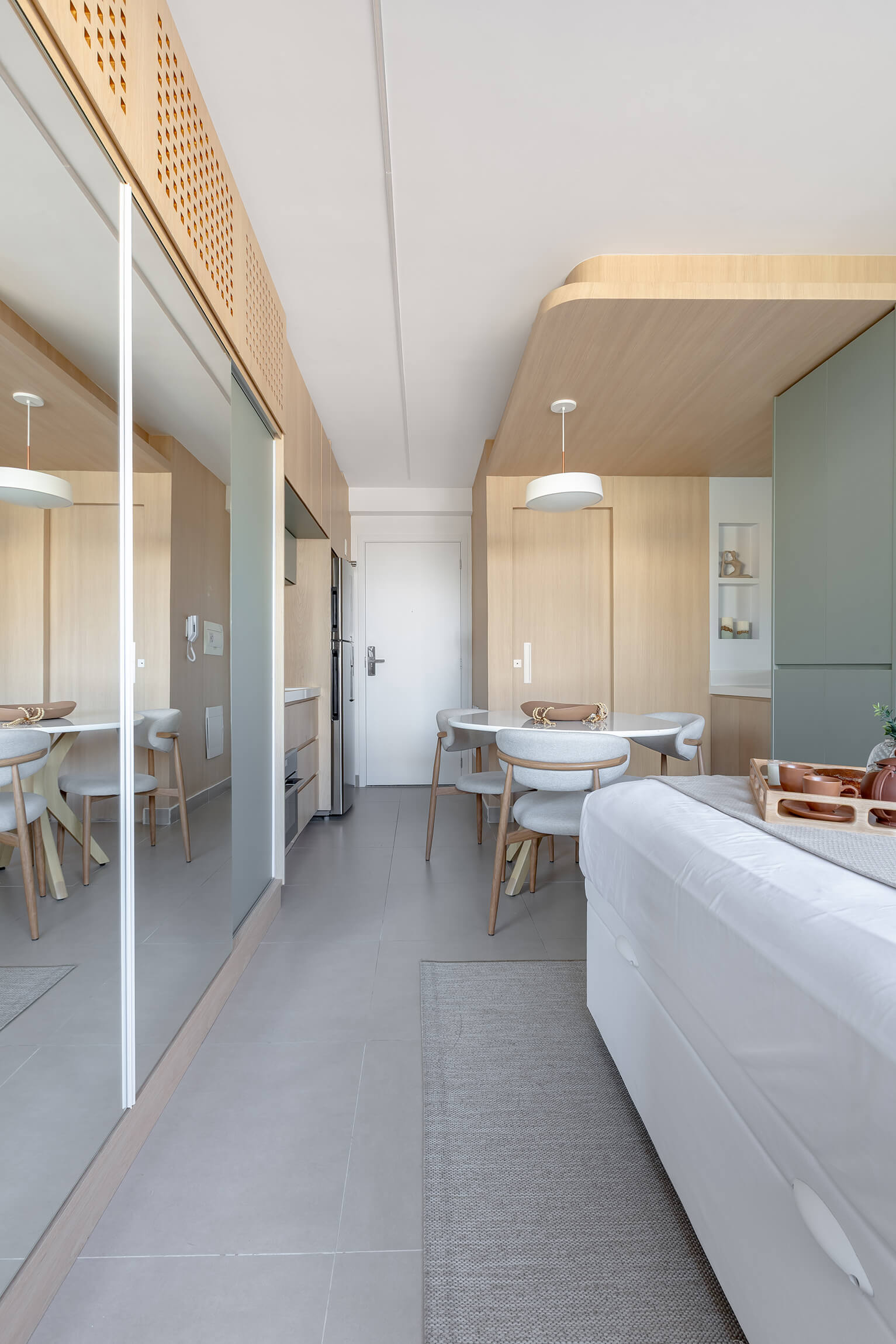 Um apartamento de 40 metros quadrados que parece muito maior. O Estúdio Orbita conseguiu criar aqui uma sensação de amplitude e calma que desafia as limitações do espaço. Cada decisão de projeto foi pensada para ampliar visualmente os ambientes, criando uma fluidez que faz o apartamento respirar.