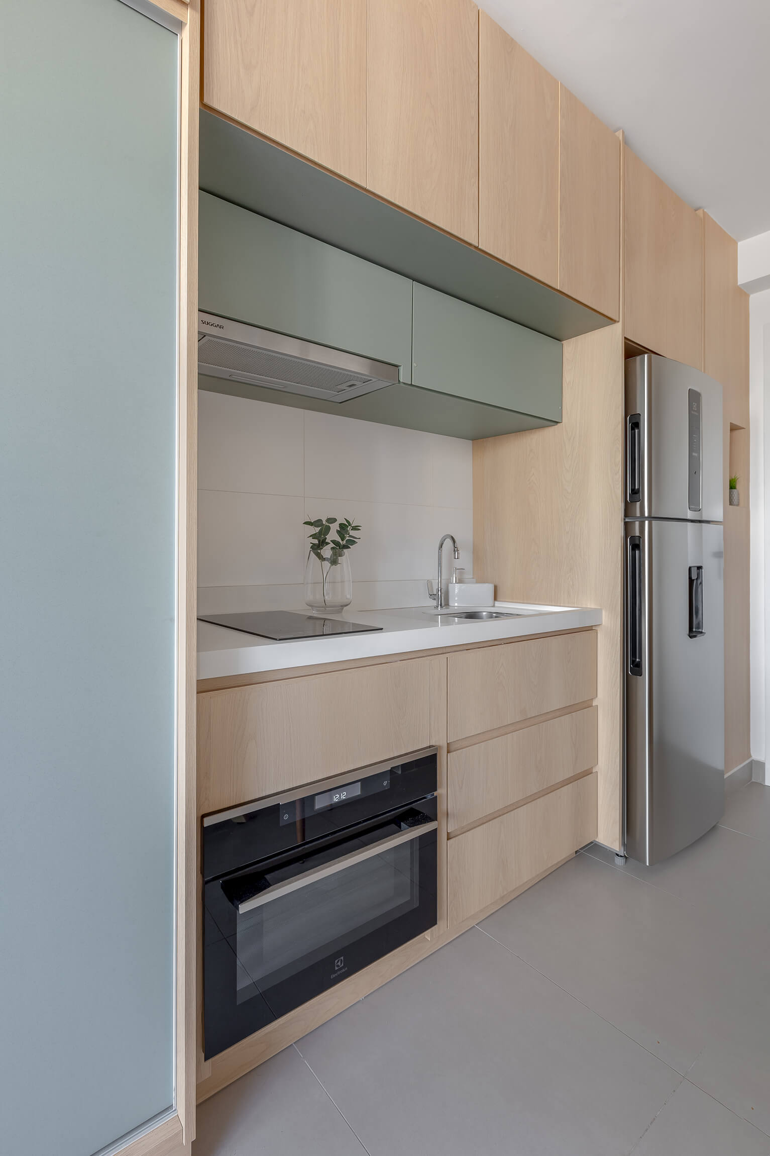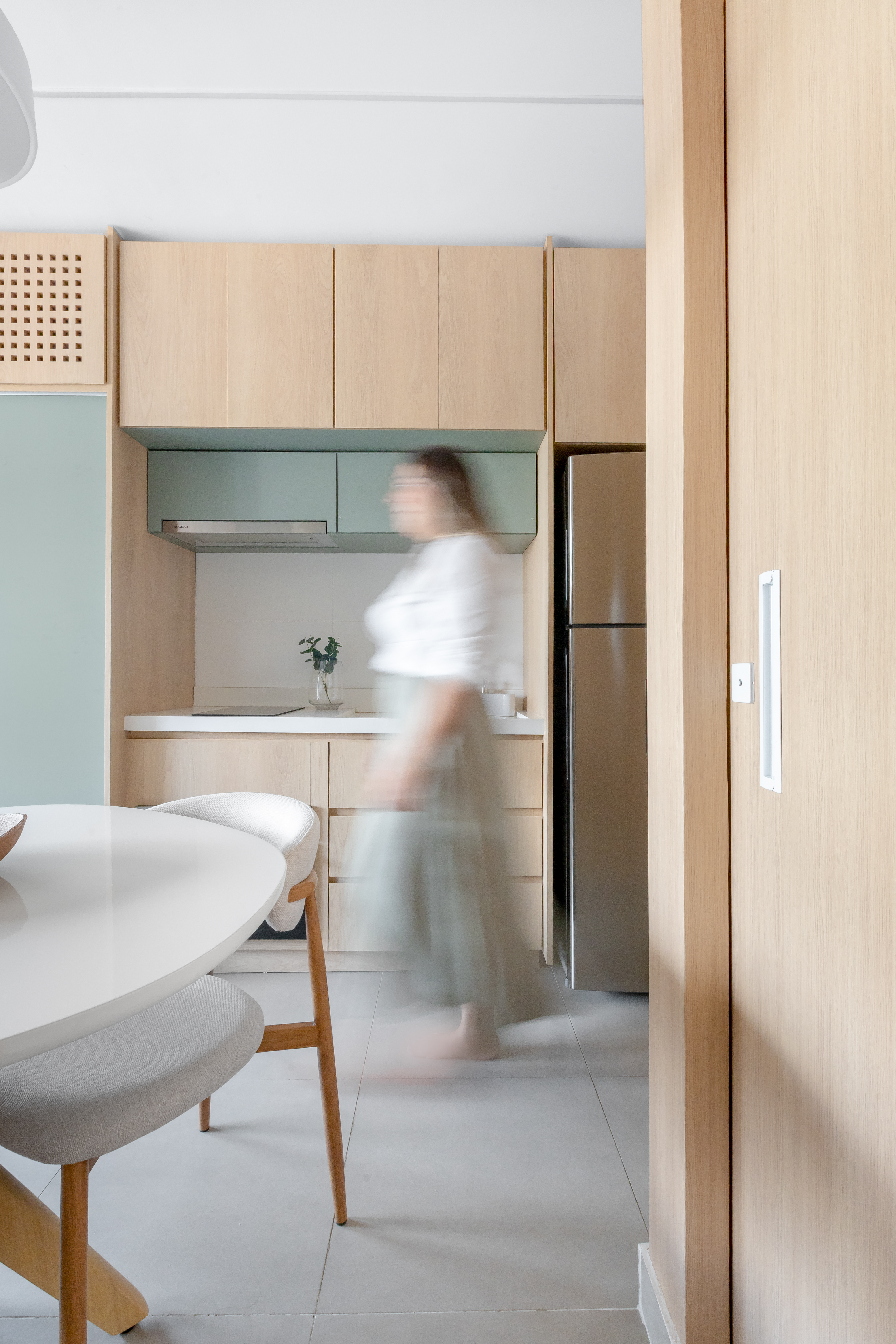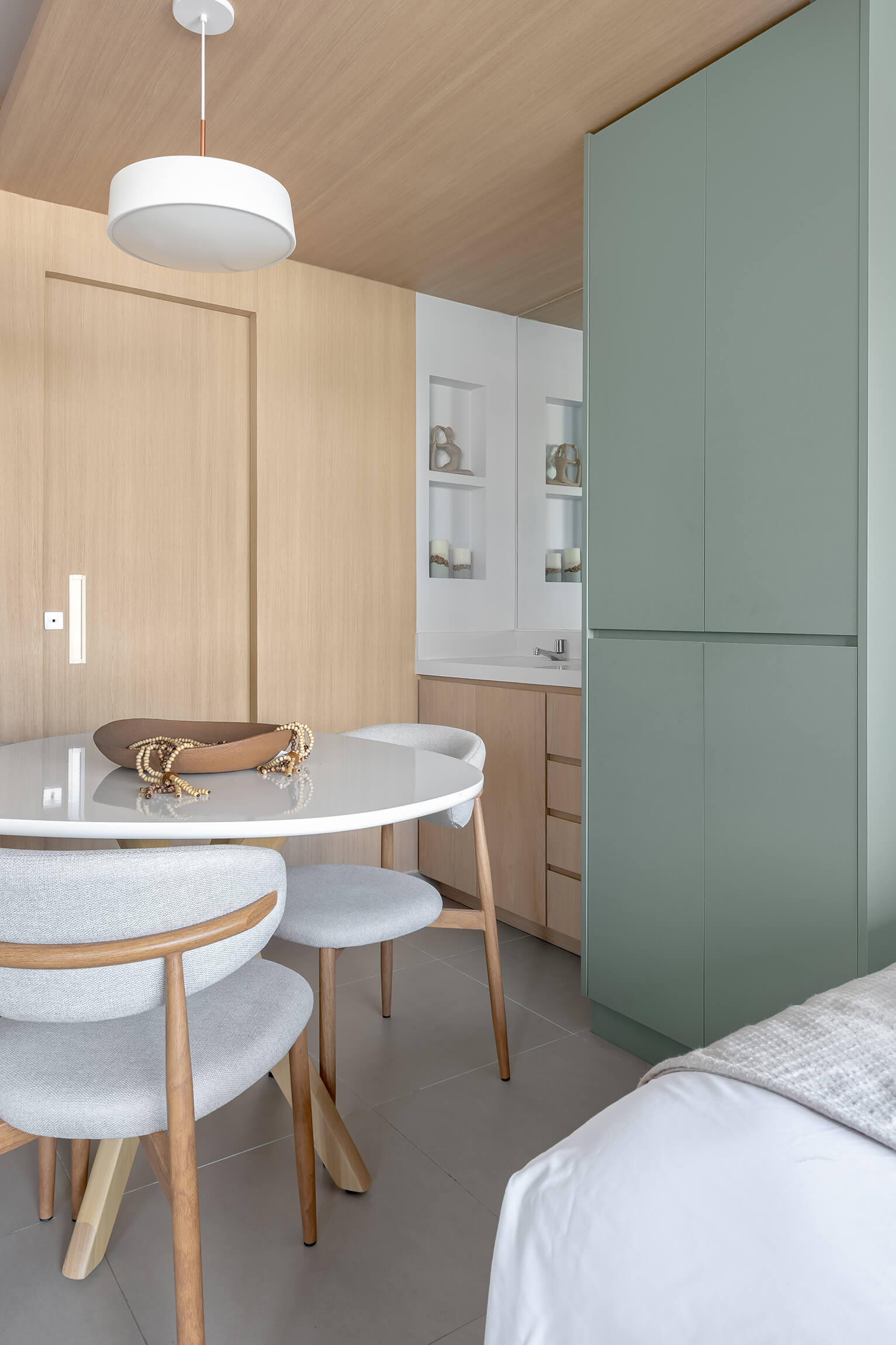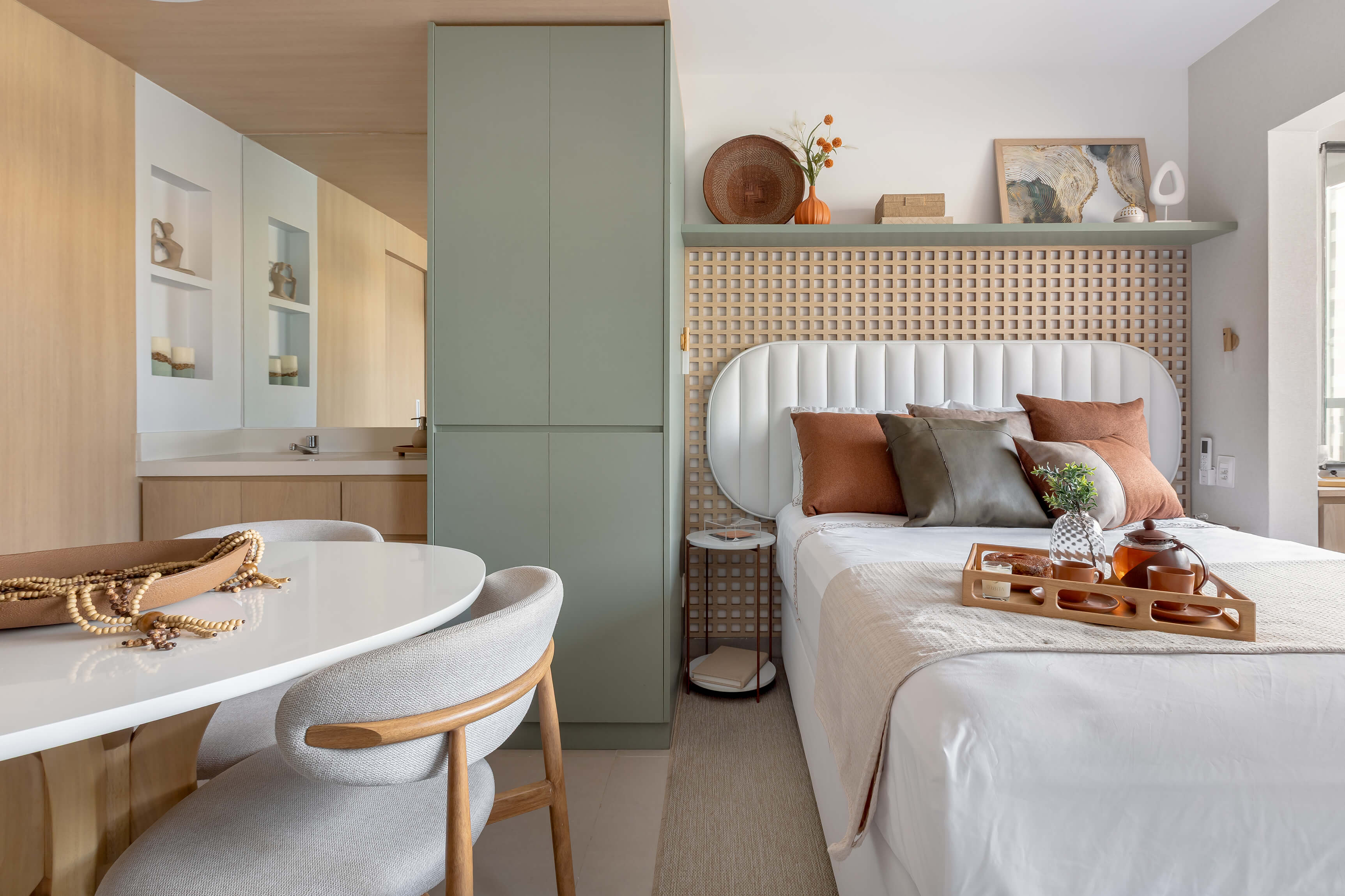 Um apartamento de 40 metros quadrados que parece muito maior. O Estúdio Orbita conseguiu criar aqui uma sensação de amplitude e calma que desafia as limitações do espaço. Cada decisão de projeto foi pensada para ampliar visualmente os ambientes, criando uma fluidez que faz o apartamento respirar.