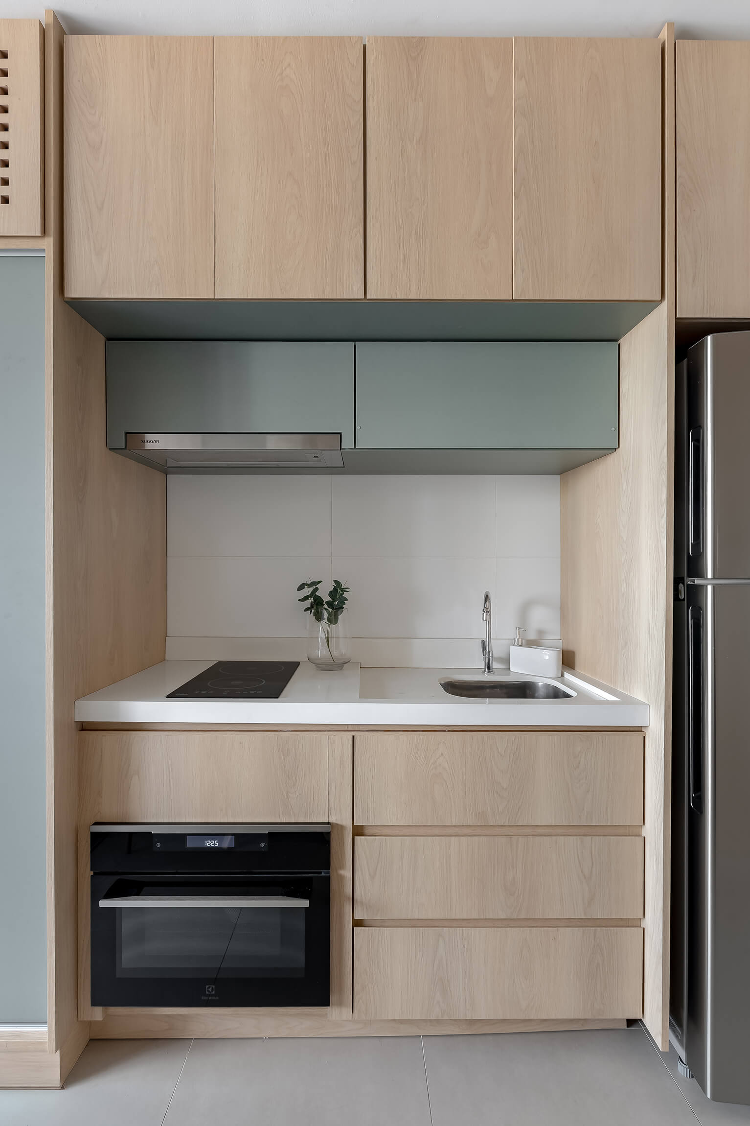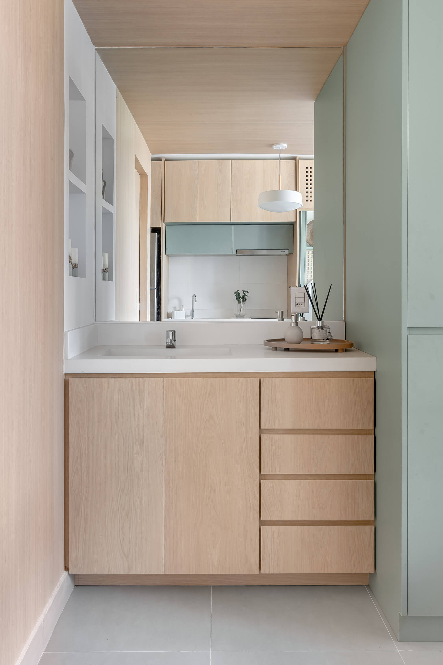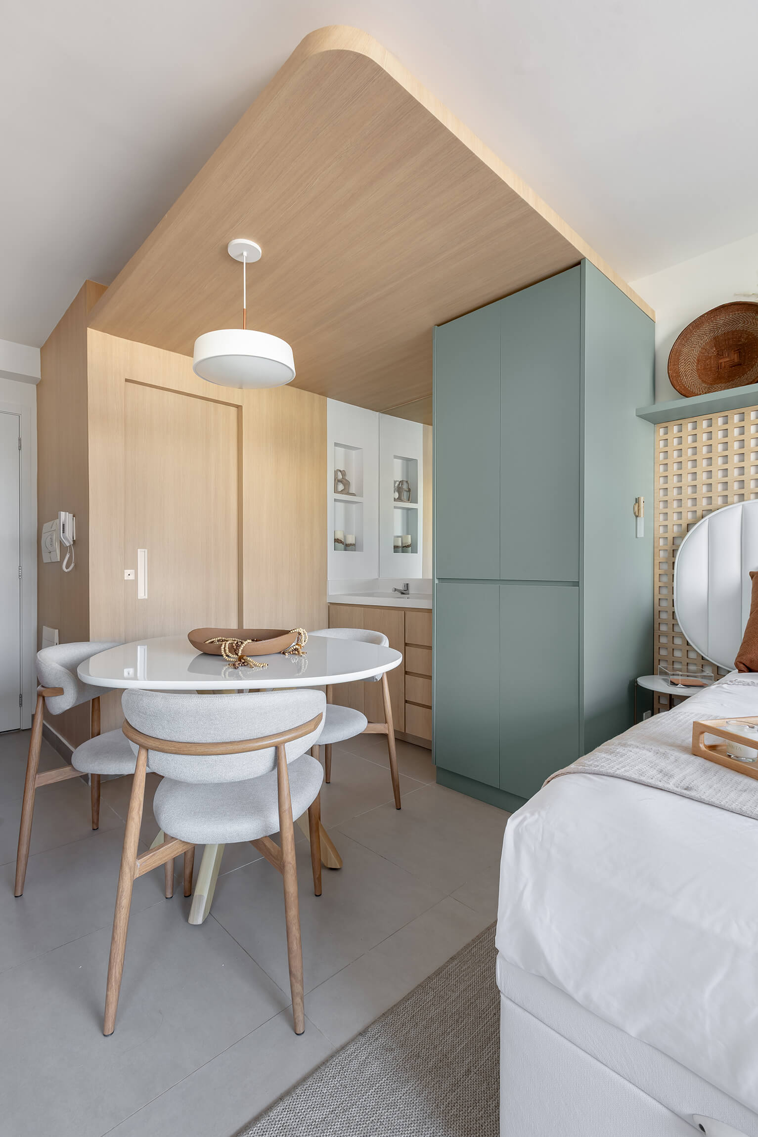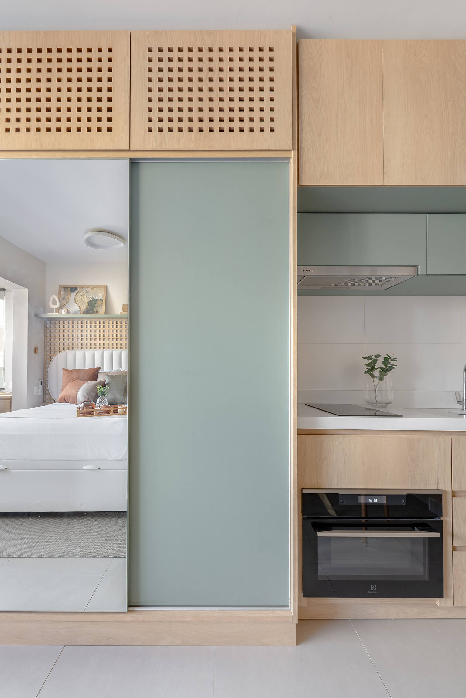 Um apartamento de 40 metros quadrados que parece muito maior. O Estúdio Orbita conseguiu criar aqui uma sensação de amplitude e calma que desafia as limitações do espaço. Cada decisão de projeto foi pensada para ampliar visualmente os ambientes, criando uma fluidez que faz o apartamento respirar.