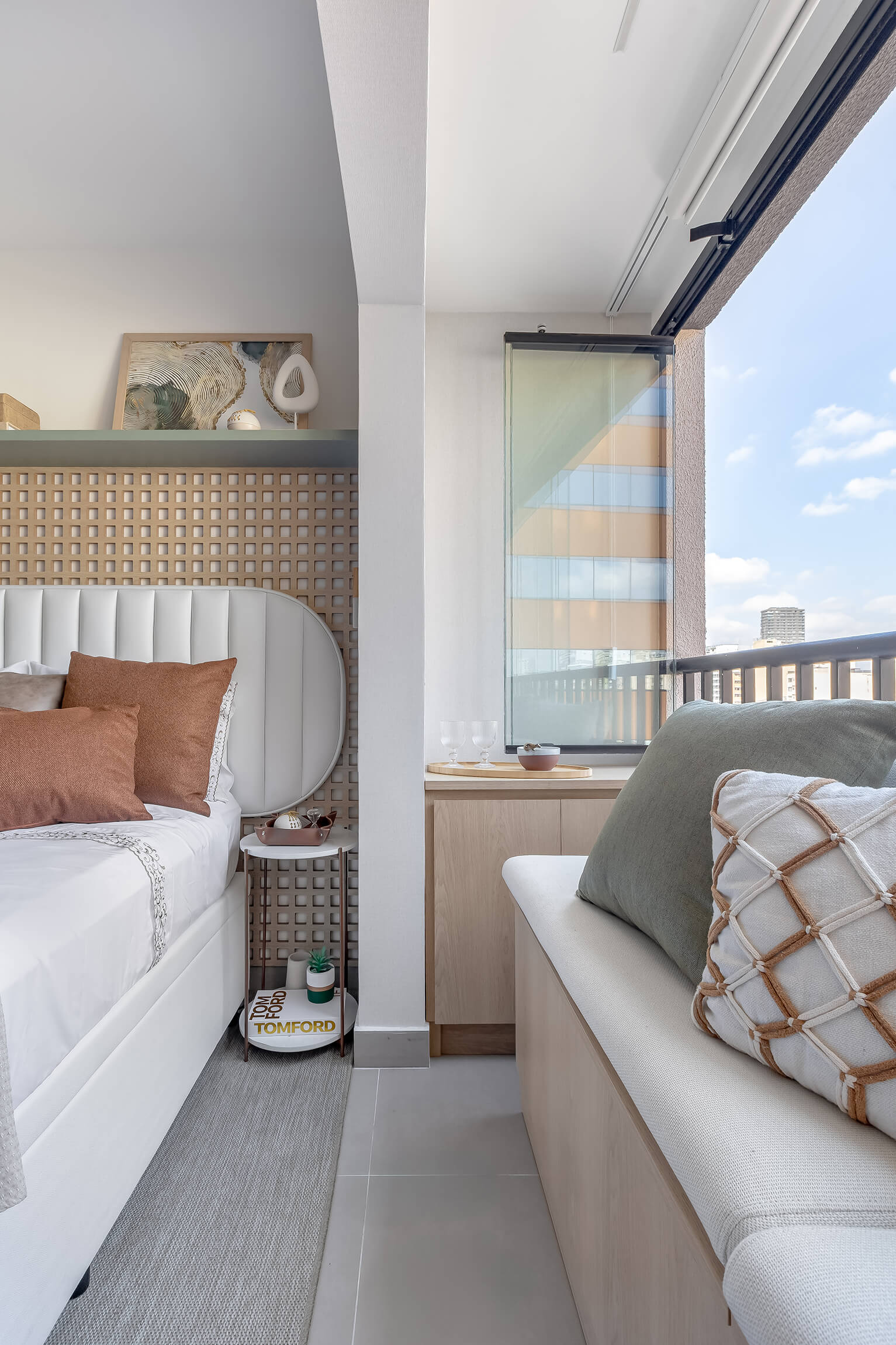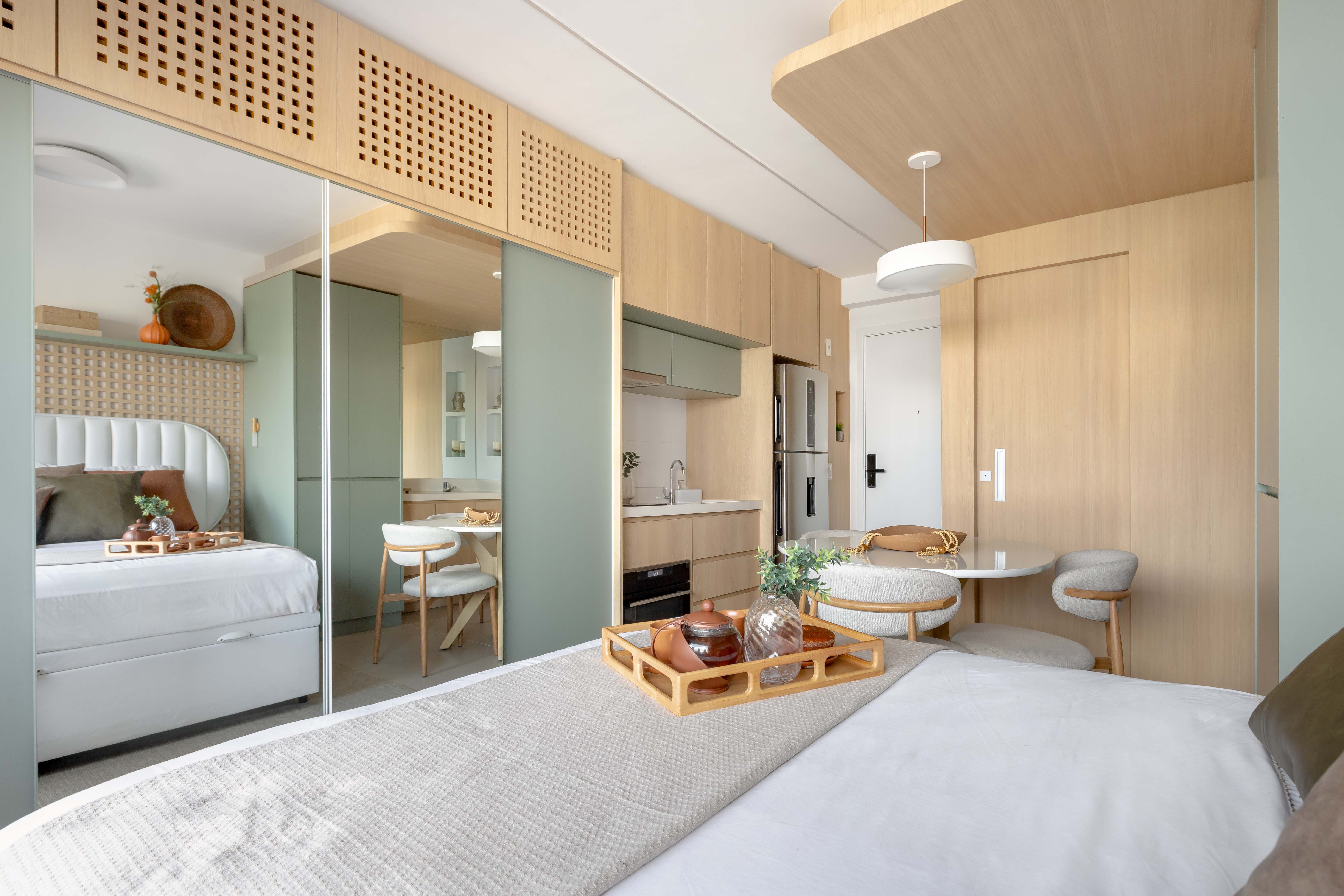 Um apartamento de 40m² que parece muito maior. Um projeto que transforma limitações em oportunidades, criando amplitude e calma através da luz e do design inteligente.